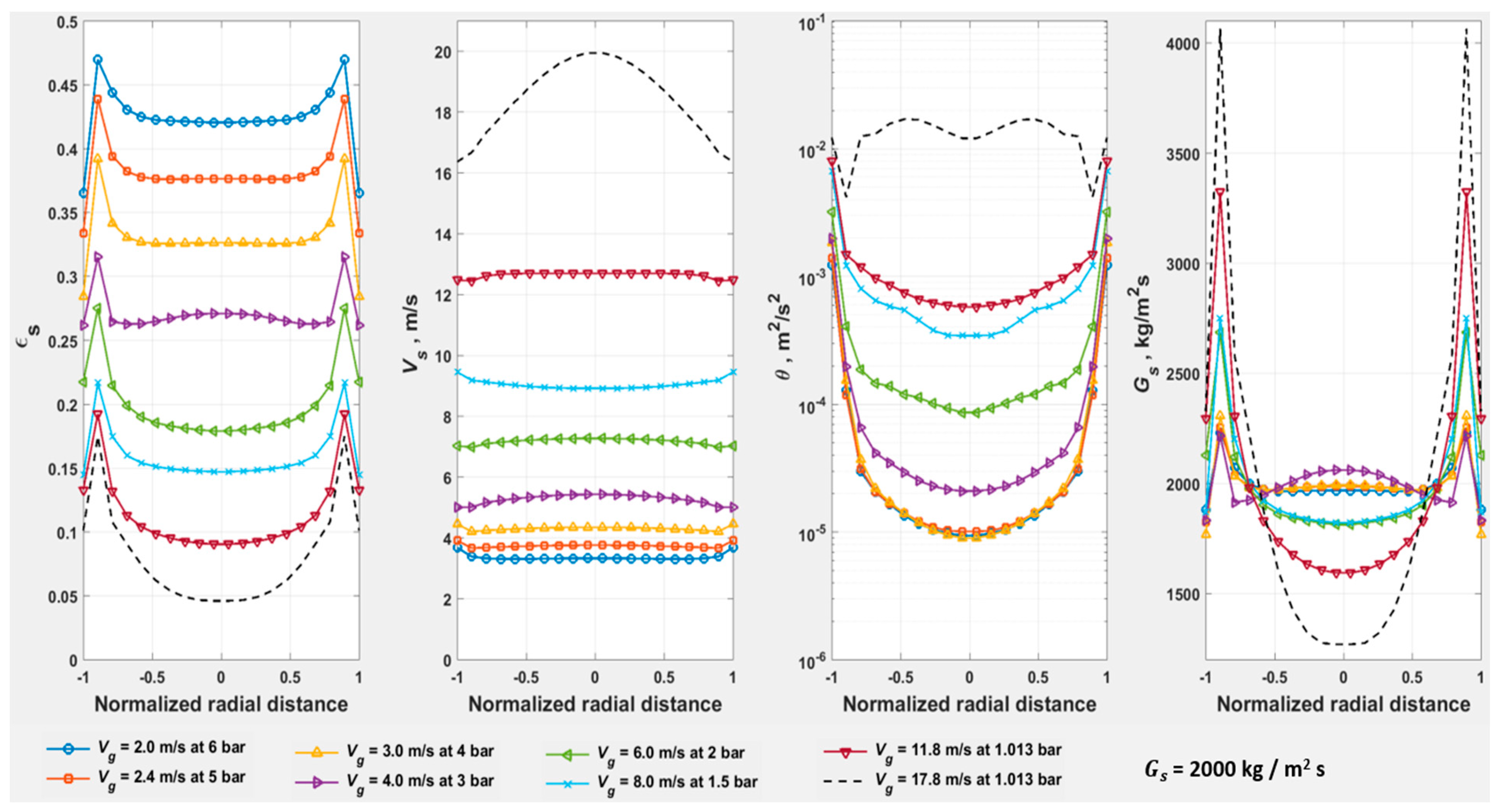 - The selected and correspond to typical FCC powders for which resolved CFB data was widely reported, including those at high (e.g., [6,16,19]), to enable model validation. However, the model validation [10] (pp. 252–267) was based on the shapes and trends in the radial profiles of and since a one-to-one correspondence cannot be expected between the monodisperse powder modeled and the experimental powders (polydisperse with significant ), and the differences between the numerical modeling and the experimental conditions (in , and ).