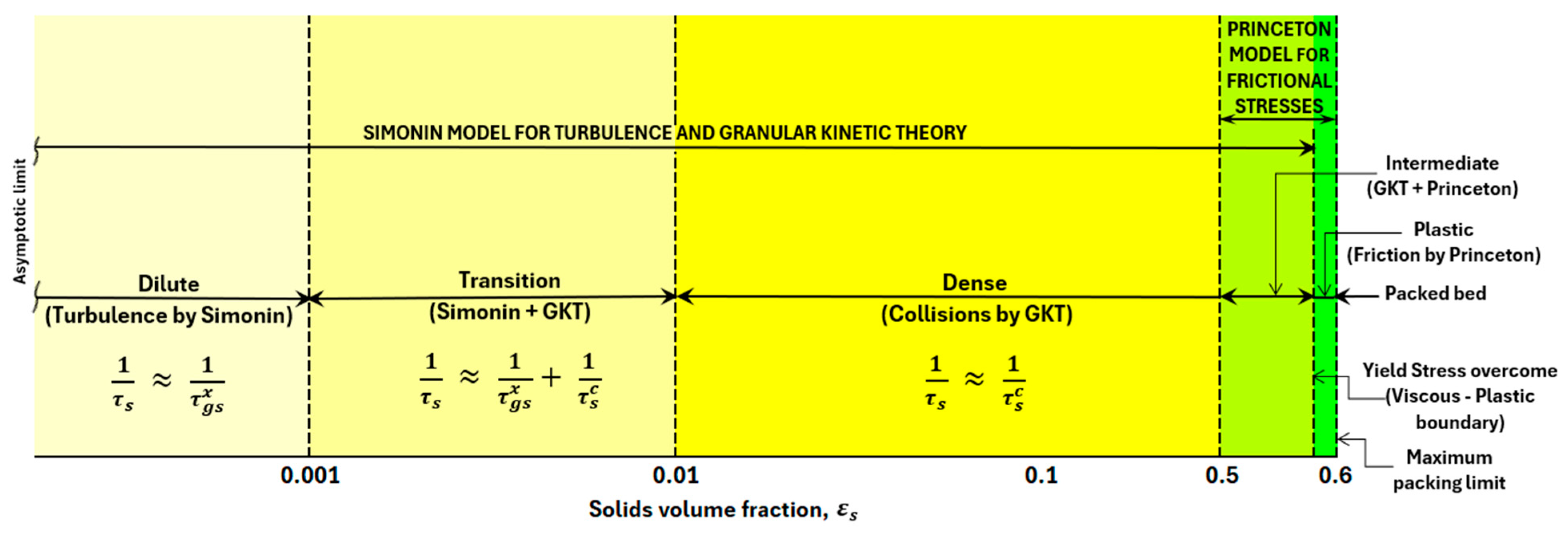 - The ‘Simonin, 1996’ viscous stress model [54,63,64,65] covers dilute turbulent through to the dense limit of the viscous regime by a dissipation time scale (), essentially a harmonic mean of collisional () and particle relaxation () time scales; the turbulence model of Simonin and the Granular Kinetic Theory are recovered at the dilute and dense limits, respectively (Figure 20).
