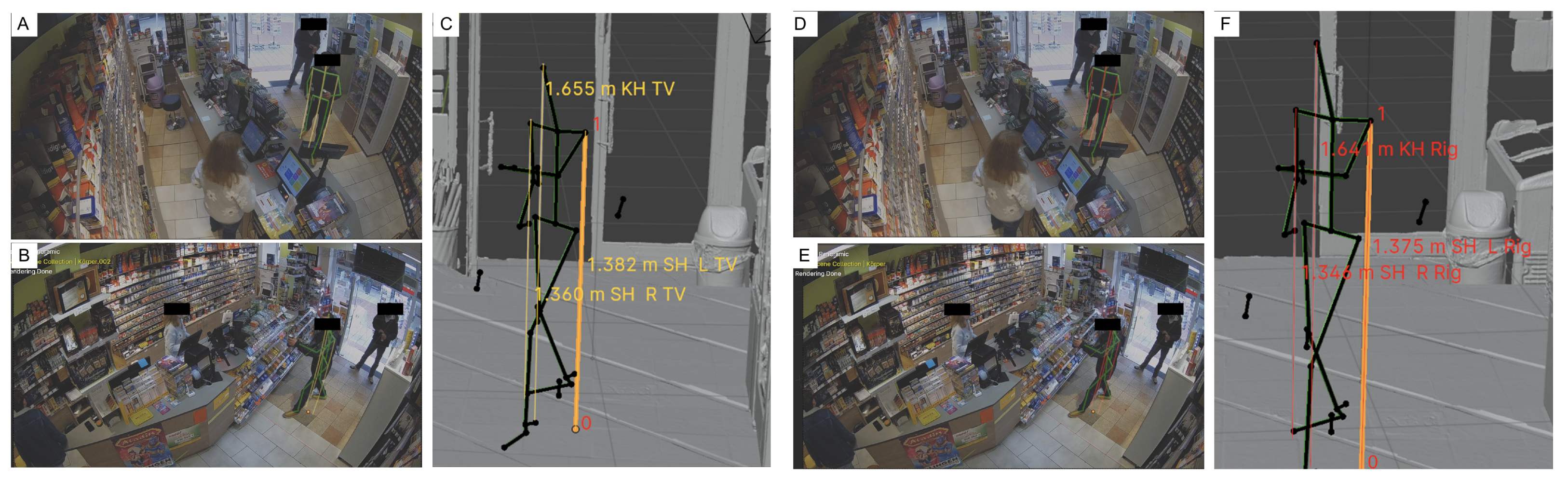 The results of the manual rig method are subject to the visual-cognitive assessment of the processor. This applies to rig creation, rig fitting, and the measurements of shoulder and head height. Human expertise and experience play a role in several areas of rig creation. First and foremost, locating and marking the relevant points on the suspect’s body requires a high level of expertise. Secondly, the recognition of markers in the recorded image material and their associated transfer into the digital space is subject to the visual cognitive assessment of the processor. Human errors in both marker placement and transfer to the digital space could potentially lead to small differences in the rig of the suspect. Similarly, the visual-cognitive assessment of the processor can influence the correct positioning and alignment of the suspect’s rig in the pose of the reference person (in this case, the suspect from the previous day and the perpetrator [