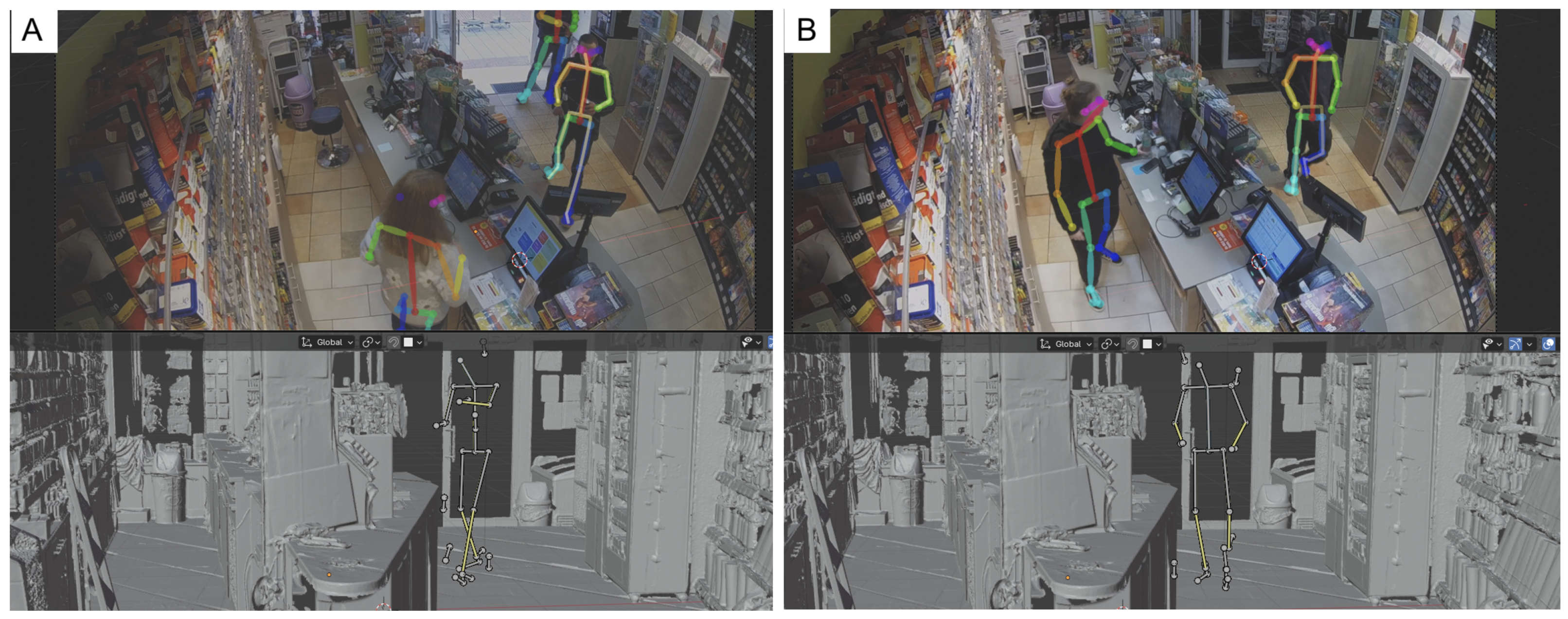 The dependence on human expertise and the time required could be reduced somewhat by the OpenPose-based method. Manual marker placement is not necessary here, which saves time and reduces human error at this point. When fitting the suspect’s rig to the pose of the reference person, the influence of the operator’s visual-cognitive assessment remains, as this step still has to be performed manually. However, human influence is reduced in the actual comparison. The OpenPose-based variant does not require measuring rods, but allows a point-to-point comparison. In addition, this can potentially increase the significance of the comparison. However, the case study clearly shows that OpenPose predictions currently contain inaccuracies and outliers. This becomes apparent when both cameras available in the kiosk should be used for fitting the OpenPose-based rig, as shown in
