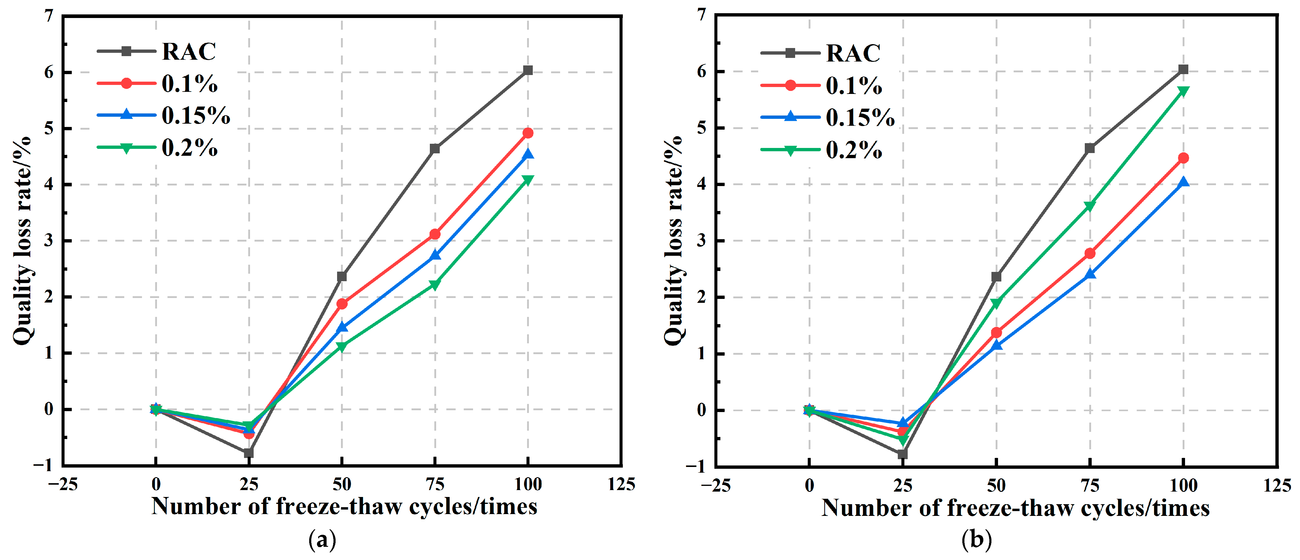 - Through systematic experimental validation, it was demonstrated that basalt fibers can effectively improve the resistance of recycled aggregate concrete (RAC) to both chloride ingress and freeze–thaw deterioration. The hybrid fiber system with a 0.15% volume fraction exhibited the most balanced performance, achieving superior durability and mechanical stability. This finding provides a reliable design reference for the incorporation of fiber reinforcement in sustainable concrete applications under coupled environmental stresses.