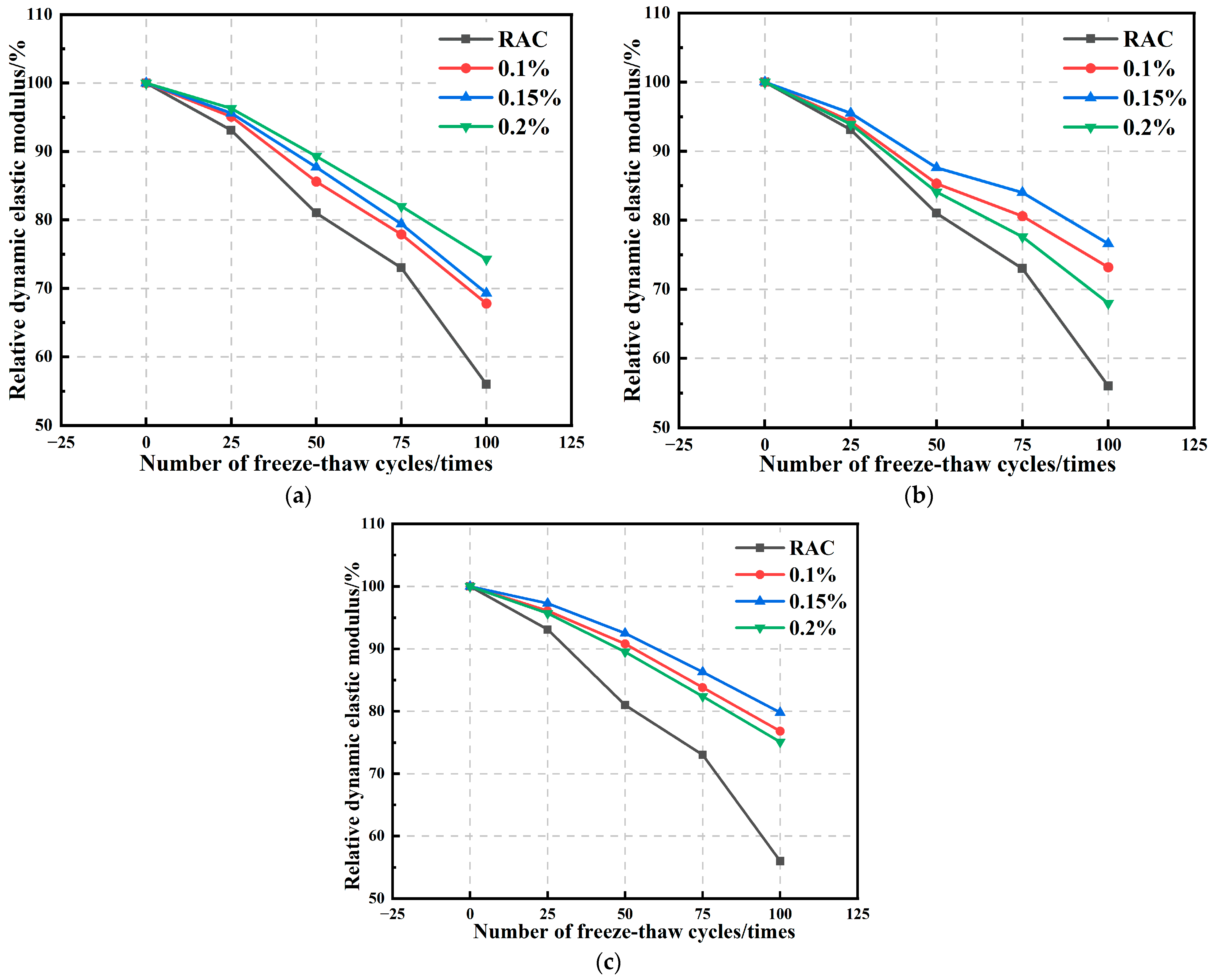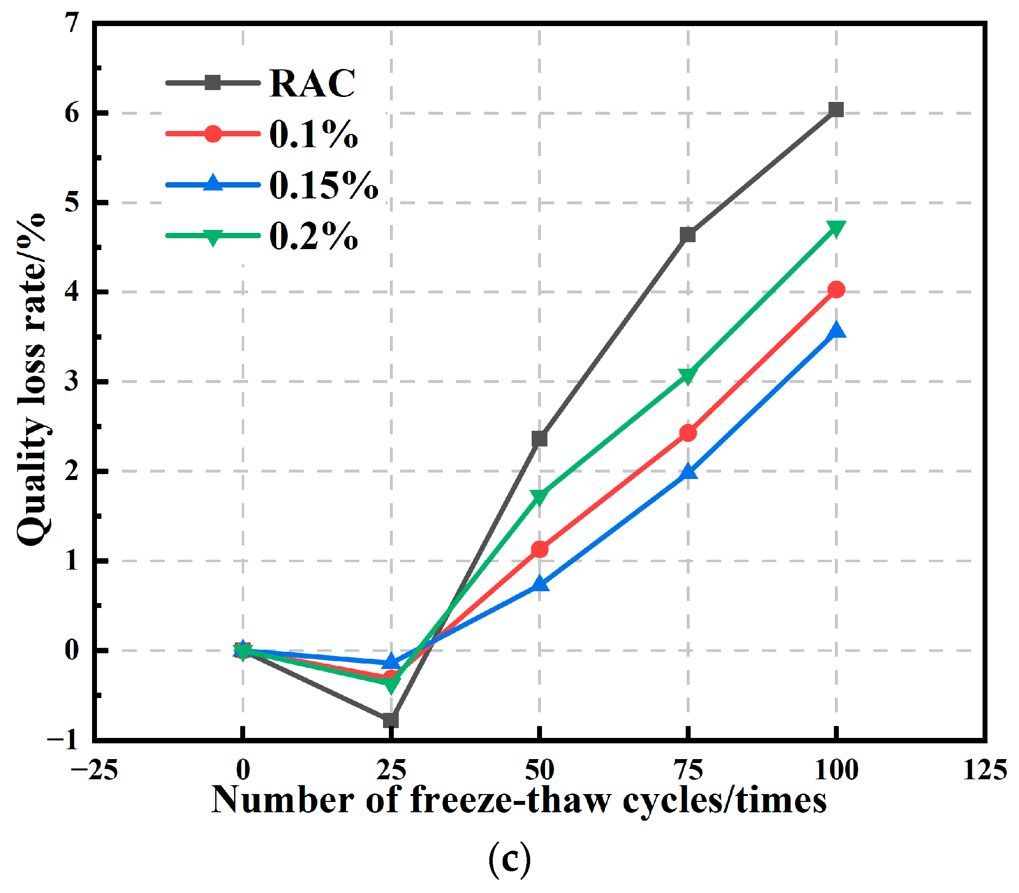 - Huang, Y.; Yang, W.; Liu, L.; Zhou, H.; Zhang, X.; Li, C.; Xiong, X. Study on freeze–thaw damage and service life prediction of glass fiber recycled concrete. Build. Struct. 2024, 54, 136–143. [Google Scholar]