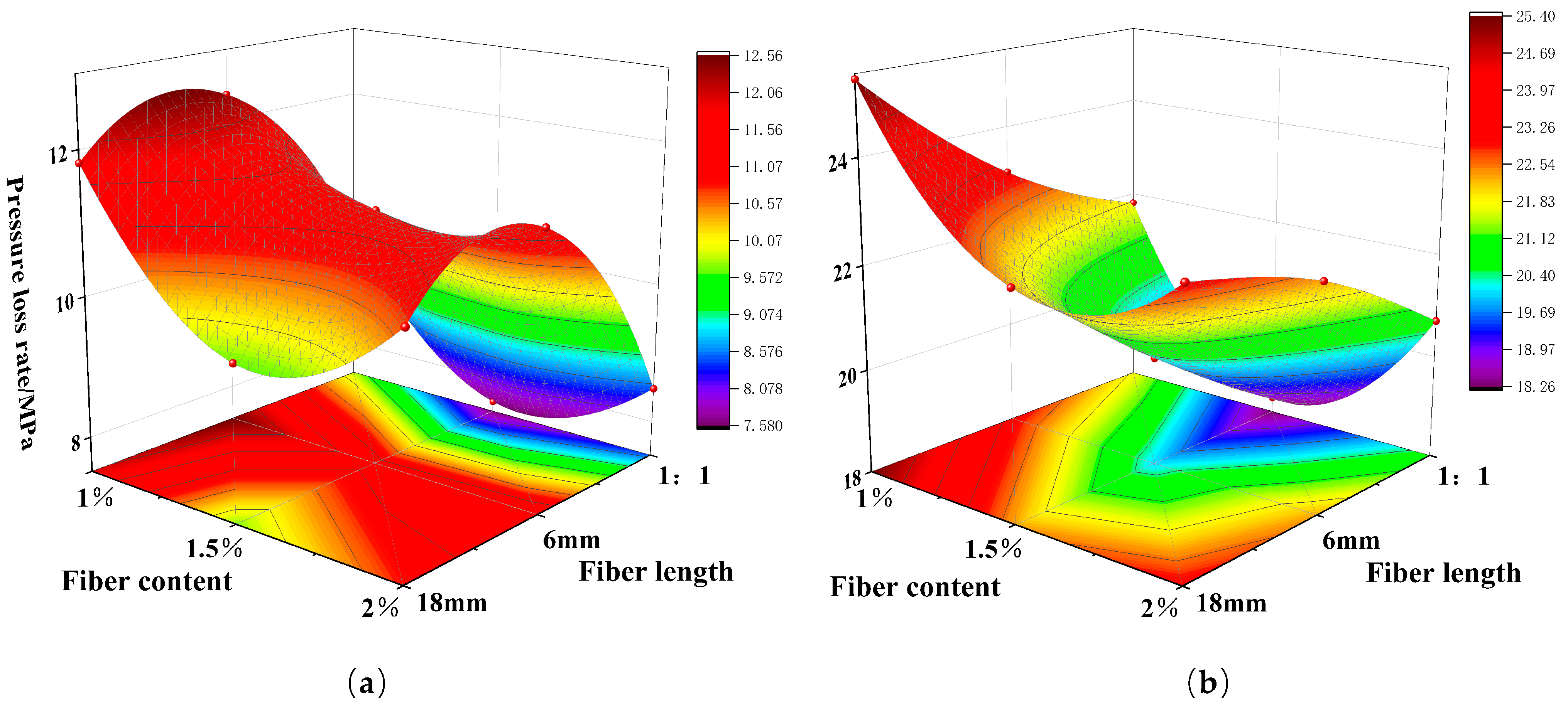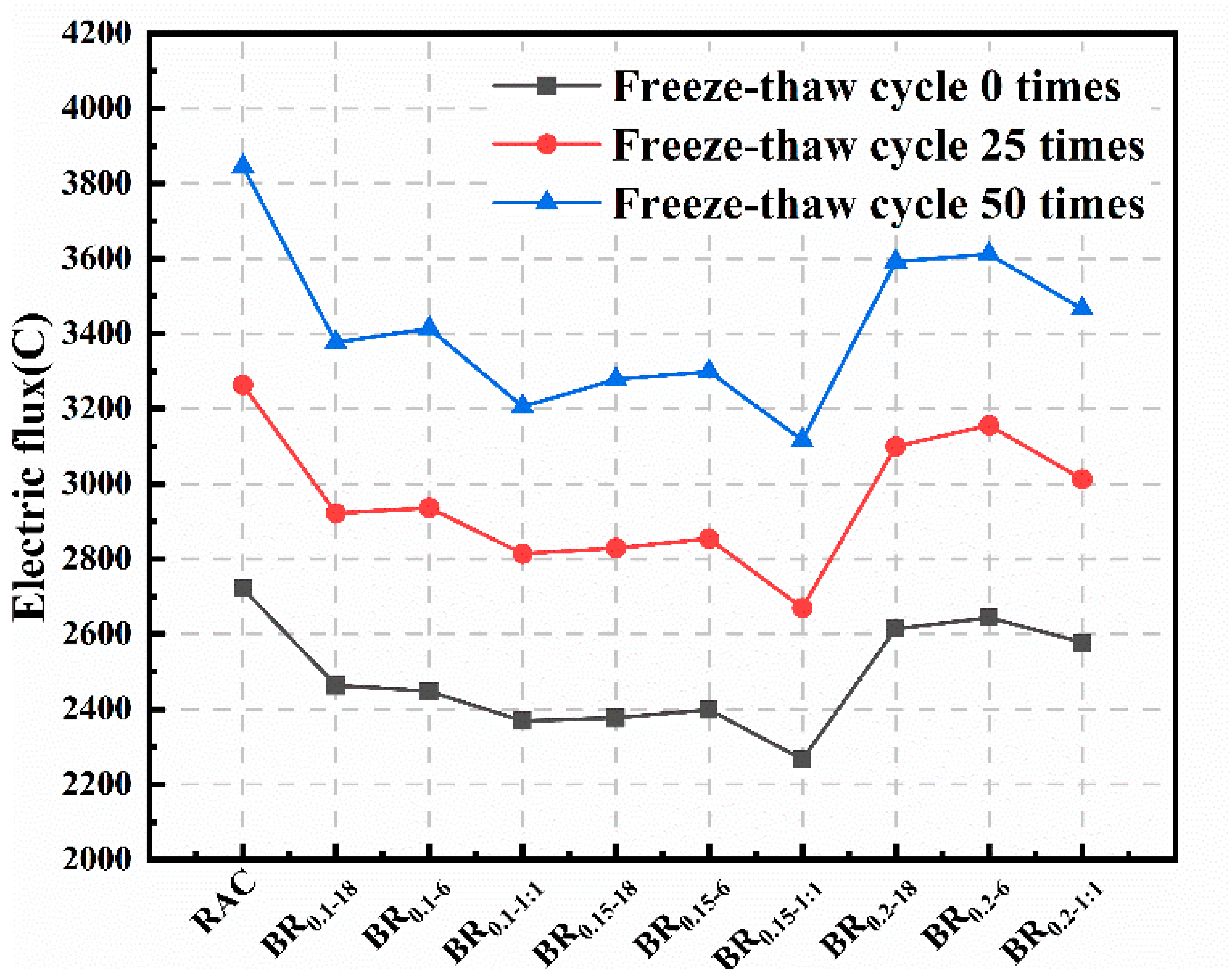 - As illustrated in Figure 8f, the random distribution of long and short fibers forms a three-dimensional interwoven network that enables multi-scale crack control and stress dispersion at the microscale. Meanwhile, the fiber network increases the tortuosity of chloride ion transport paths, effectively delaying ion migration per unit time. These microstructural observations are consistent with the 16.7% reduction in electric flux measured in the experiments, jointly confirming the beneficial role of hybrid basalt fibers in enhancing both the mechanical integrity and chloride resistance of RAC.