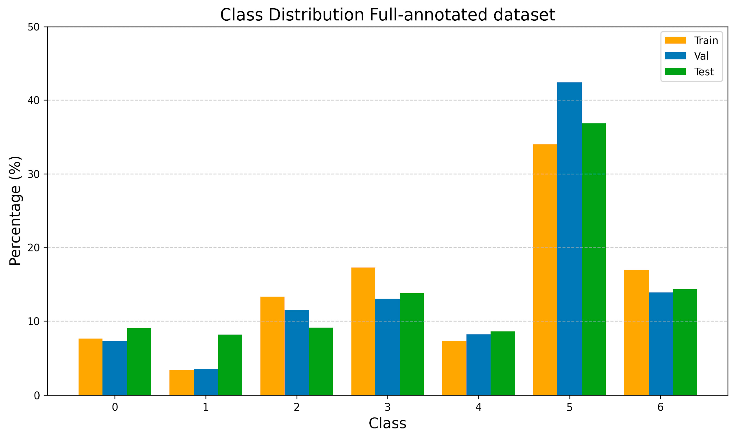 Model performance was assessed using standard classification and segmentation metrics: accuracy, precision, recall, and F1-score. All metrics, except for accuracy, were reported in their macro-averaged versions, ensuring equal weight for each class regardless of its frequency in the dataset. The Jaccard index, computed as the Intersection over Union (IoU), was additionally included for all temporal models after applying the UATD pseudo-label propagation method, to facilitate direct comparison with the results reported in the original Less is More study [