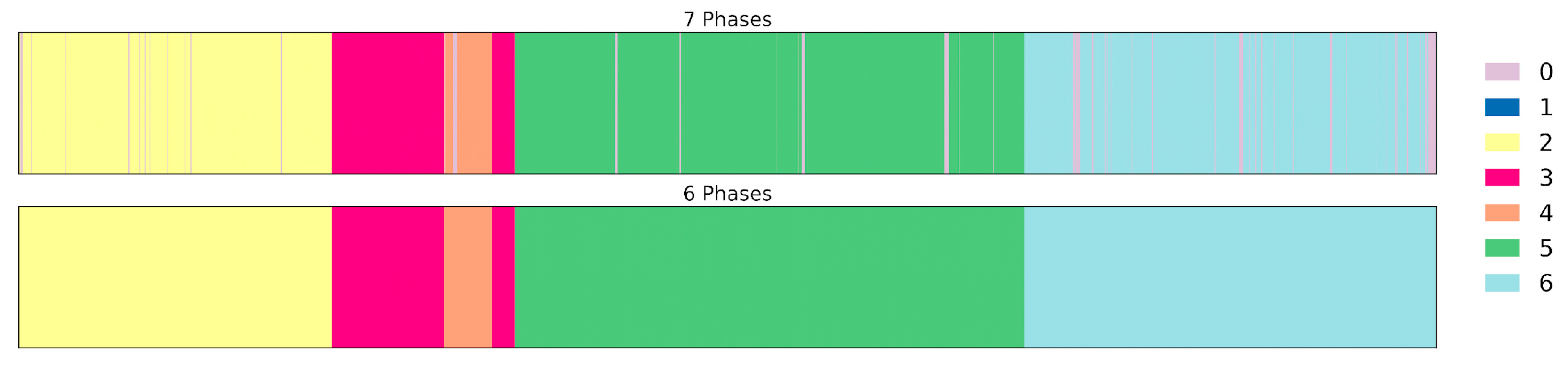 Despite this adjustment, P0 remained substantially overrepresented due to its recurrent nature. To mitigate this imbalance, an additional line of experimentation was conducted using a six-phase configuration, in which P0 was removed and its frames were reassigned to the preceding phase, as shown in