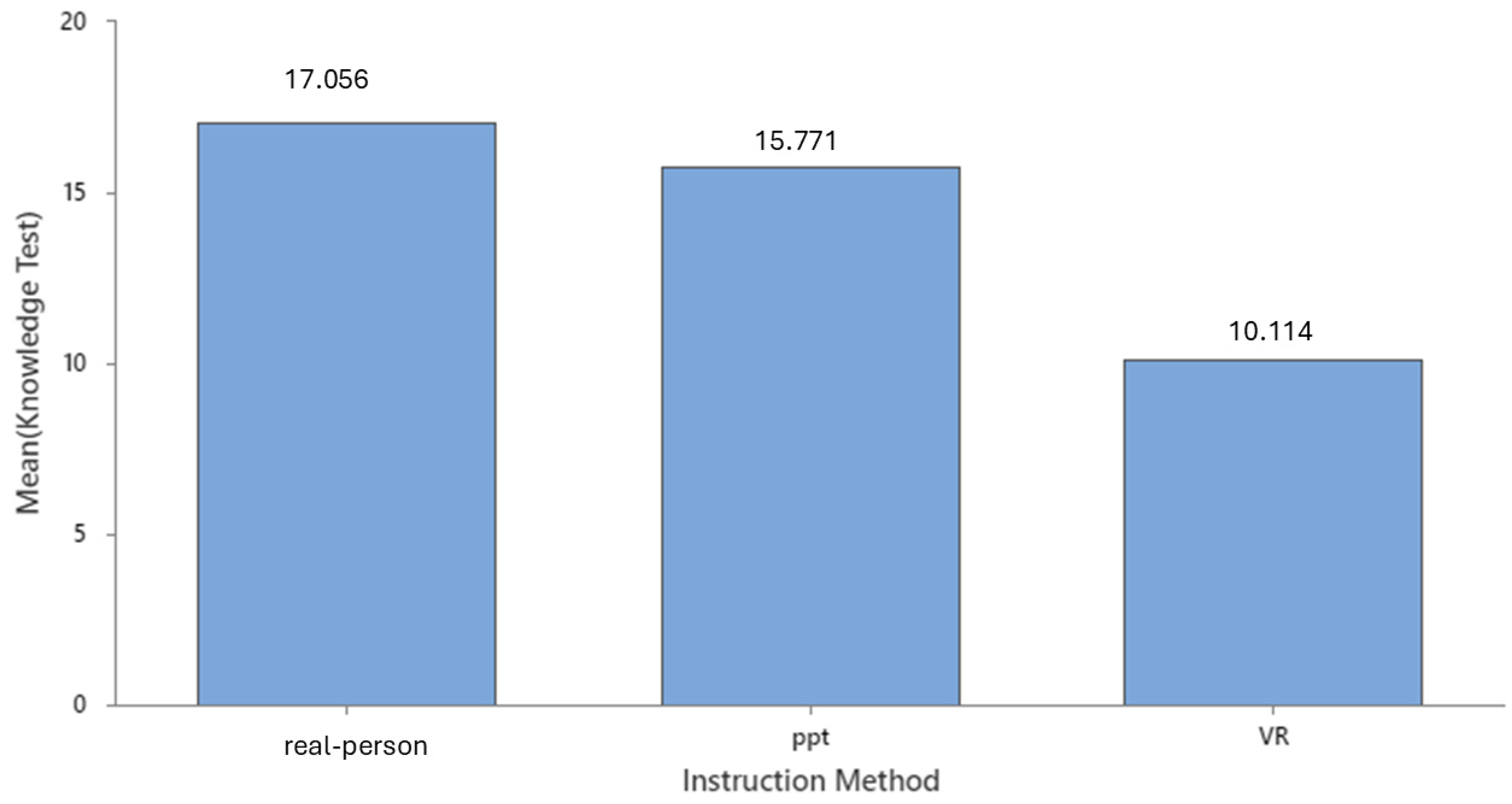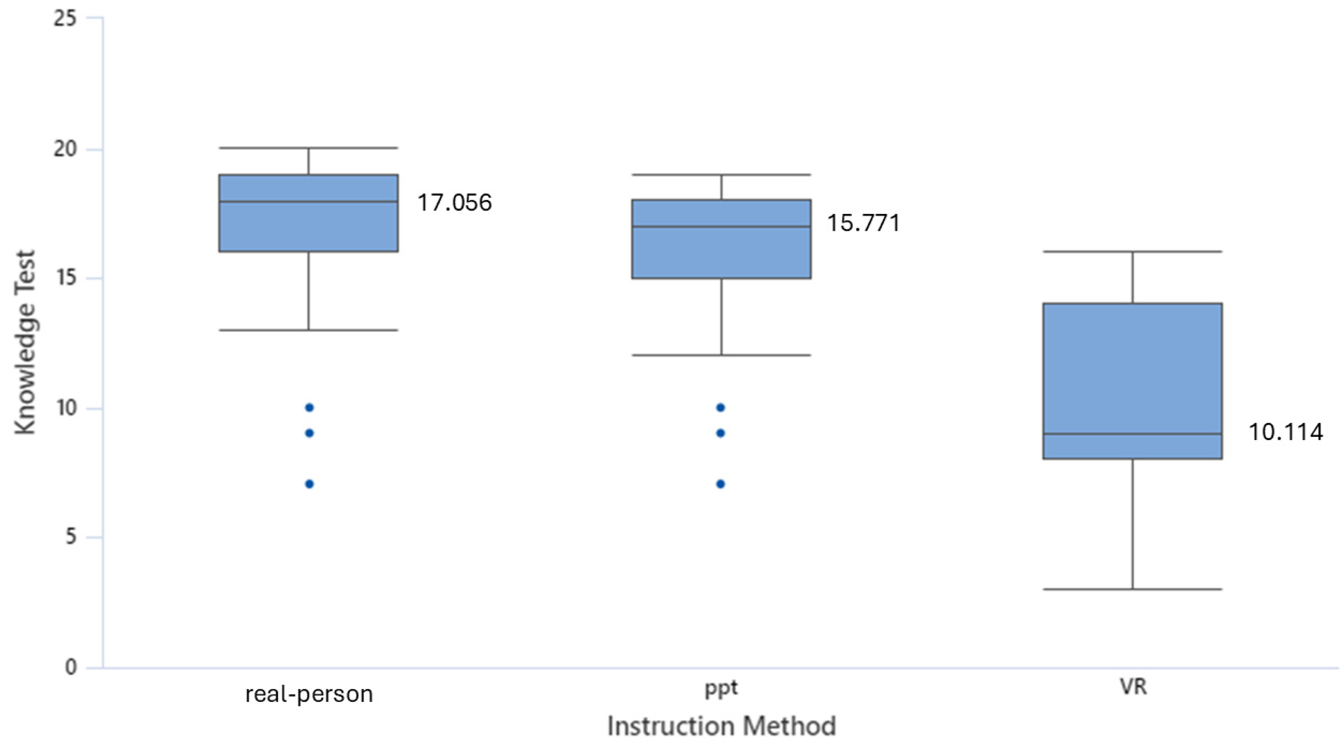 - Instructional method had a significant effect on immediate knowledge retention, with VR producing lower scores than both PowerPoint and Real-person instruction.