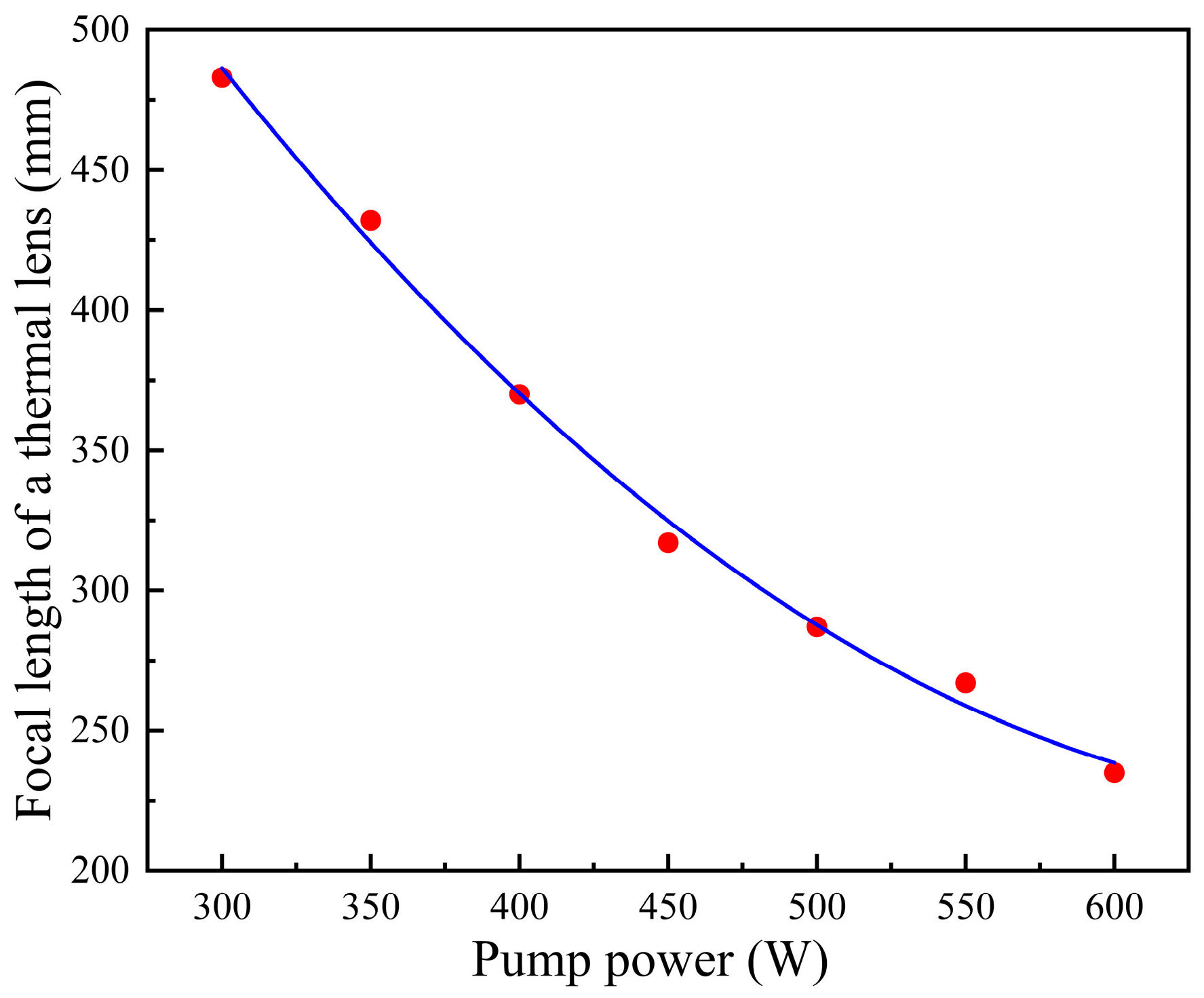 The focal length of the thermal lens was determined by expanding a probe laser beam and focusing it through the Nd:YAG crystal [24], with the results shown in Figure 5. During the continuous increase in the pump power, the thermal focal length value of the laser crystal exhibited a decreasing trend.