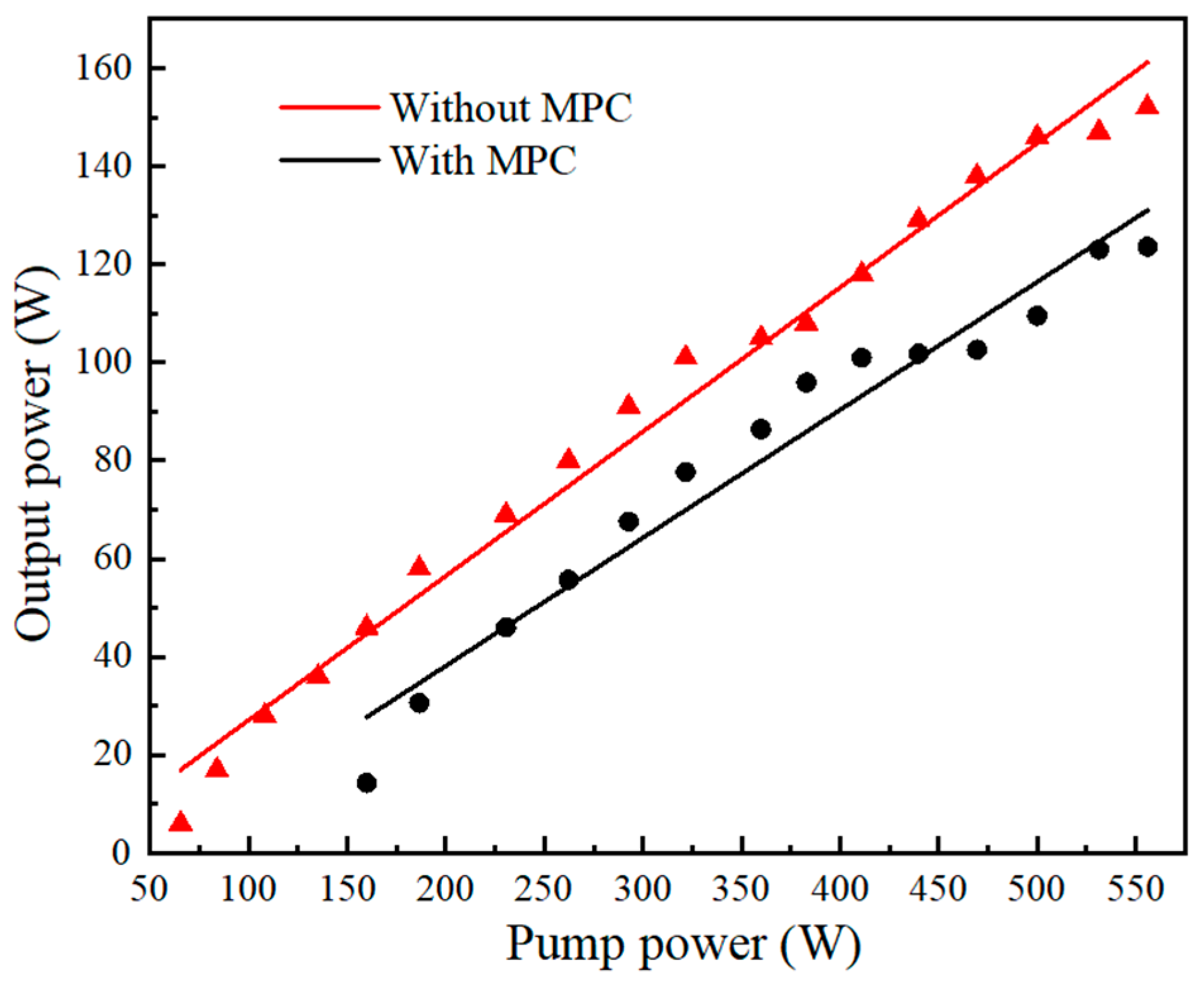 In this experiment, the curves of the average power of the 1064 nm laser versus the pump power with and without the MPC in the cavity were measured using a power meter (Ophir, FL600A-BB-65) (Jerusalem, Israel), and the results are shown in Figure 8. At a repetition rate of 10 kHz, the average power of the 1064 nm laser exhibited a linear increasing trend with the gradual increase in the pump power. In the figure, the red and black curves represent the output power curves without and with the MPC, respectively. At a repetition rate of 10 kHz, when the pump power reached its maximum value of 555.8 W, the maximum average output power without the MPC structure was measured to be 154 W, corresponding to an optical-to-optical conversion efficiency of 27.7%. When the MPC was inserted to extend the cavity length, the maximum average output power was 123.6 W, with an optical-to-optical conversion efficiency of 22.2%. The decrease in power was attributed to the reflection losses from the mirrors in the MPC structure and the additional mirrors M5~M7 within the cavity, as these mirrors lacked angle-specific coatings for the incident beams. Furthermore, the introduction of the MPC also increased the lasing threshold of the resonator.