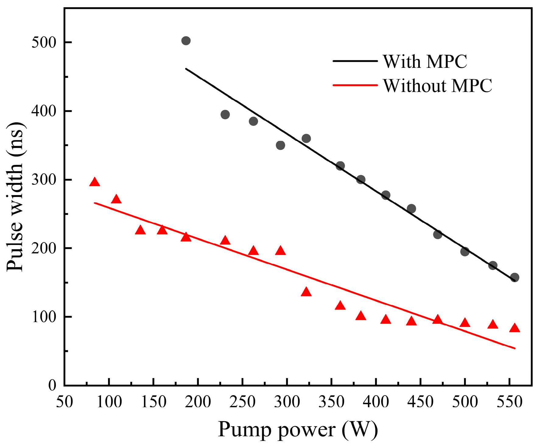 Figure 9. Curves of 1064 nm laser pulse width at 10 kHz versus pump power with and without an MPC.