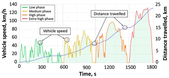The tests were conducted according to the WLTP. The WLTC 3b cycle was used, which is applicable to vehicles with a power-to-mass ratio that is greater than 34 W/kg and a maximum speed equal to or exceeding 120 km/h. The entire cycle has a duration of 1800 s, covers a distance of 23.267 km, and has an average speed of 46.5 km/h. The profile is dynamic across all phases, with frequent acceleration and deceleration events, and is designed to be more accurate to real-world driving conditions. Figure 3 shows the speed–time profile of the driving cycle.