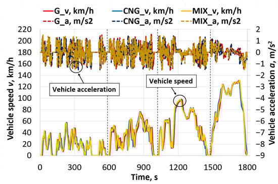The instantaneous vehicle acceleration profiles supplement the cycle validation (Figure 5). The acceleration profiles for all three fuels were nearly identical, which confirms that the driver accurately replicated the dynamic demands of the WLTC. This consistency was particularly evident during braking events. For example, the maximum deceleration values varied only slightly between the tests: −1.546 m/s2 for gasoline, −1.534 m/s2 for CNG, and −1.540 m/s2 for the dual-fuel mode. All of these measured values are in close agreement with the −1.5 m/s2 maximum deceleration specified by the official standard. The maximum acceleration values reached 1.573 m/s2 (G), 1.435 m/s2 (CNG), and 1.532 m/s2 (MIX), respectively. Although they show slight variation, as expected in a manually driven test, they all remain close to the cycle’s most aggressive requirement—1.666 m/s2, which was reached during the high-speed phase.