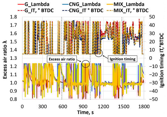 The engine control parameters (Figure 8) illustrate how the engine control logic adjusts the fuel mixture composition and its ignition, depending on the fuel used. The final normalized fuel consumption values (kg/100 km) are derived by integrating these instantaneous mass flow rates over the total distance traveled. Analyzing the engine control system, a difference is observed in the excess air ratio (λ) values. In gasoline mode, the engine operated with a nearly ideal stoichiometric mixture, with a cycle average of λ = 1.004. Meanwhile, the CNG mode operated with a slightly leaner mixture—the average λ coefficient reached 1.056, while the MIX mode operated close to the stoichiometric (λ = 1.009). The difference in λ values directly determines the ignition timing (IT) control strategy.