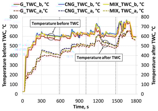 The temperatures before (pre-TWC) and after (post-TWC) the catalytic converter, during the WLTC.