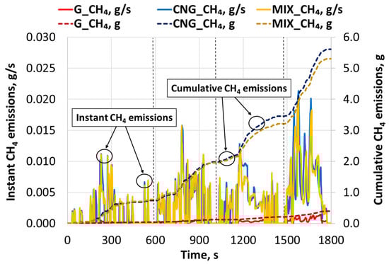 Variation in instant and cumulative CH4 hydrocarbon emissions during the WLTC.