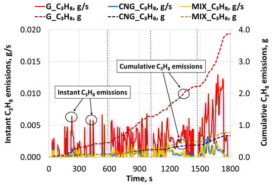 The trends in non-methane hydrocarbons emissions (measured as C3H8-equivalent) (Figure 13) show an opposite pattern compared to methane. Instantaneous MNHC emissions are generally much lower than CH4 and rarely exceed the 0.010–0.015 g/s threshold, although the peaks in the gasoline mode are clearly higher than in the gaseous modes. Cumulative emissions and normalized average values confirm this difference. In gasoline (G) mode, the average NMHC emission reached 0.167 g/km. Using compressed natural gas, this emission drastically decreased to 0.029 g/km, and in mixed (MIX) mode, to 0.033 g/km. This means that switching to CNG reduced NMHC emissions by 82.7%, and in MIX mode, by 80.2%, compared to gasoline. The higher amount of NMHC during gasoline combustion is associated with the incomplete oxidation of heavier liquid fuel hydrocarbon components, especially during cold engine operation and transient modes (acceleration), when the air–fuel mixture is richer and combustion is less uniform []. Natural gas contains only a small impurity of NMHC (~0.35% by volume), so its emissions are naturally much lower. Summarizing the methane and non-methane hydrocarbon analysis, it is noted that the transition from gasoline to CNG fundamentally changes the structure of unburned hydrocarbon emissions: non-methane emissions decrease significantly, but emissions of the main component—methane—increase by approximately 14-fold.