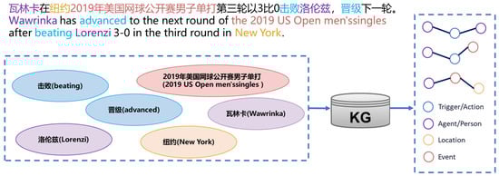 Knowledge augmentation has emerged as a promising approach for event prediction, enhancing both the interpretability of NLP models and the performance of downstream tasks. Existing methods [,] typically adopt a retrieval-and-integration paradigm, relying heavily on structured data, particularly knowledge graphs (KGs). This paradigm involves extracting event elements from text, retrieving relevant triples from KGs, and integrating them into event representations. While effective in structured knowledge scenarios, these approaches are inherently limited by the KG’s scale and timeliness, etc. As depicted in Figure 1, taking the sentence “Wawrinka has advanced to the next round of the 2019 US Open men’s singles after beating Lorenzi 3–0 in the third round in New York.” as an example, event prediction based on KGs would face three limitations.