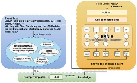 This structured format helps the ERNIE model distinguish the original event text from the LLM-generated knowledge, learning to integrate them effectively. Subsequently, the input is tokenized and fed into the ERNIE model to generate contextualized embeddings, which are then processed by a pooling layer. The output of the pooling layer is transmitted through a fully connected layer, which maps the high-dimensional embedding to the specified number of output classes: