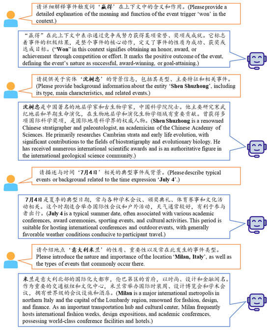 For example, consider the sentence above, by applying the templates presented above, an LLM can generate rich background knowledge for each event element, as illustrated in Figure 3.