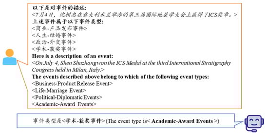 Event arguments provide rich, detailed information for the event, covering key dimensions such as entities, time, and location in the event. These arguments constitute important background information for understanding the event. Taking the above sentence as an example, “Shen Shuzhong” is the main entity of the event, “ICS Award” is the entity receiving the award, “the Third International Congress of Stratigraphy” is the background venue of the event, and “Milan, Italy” is the geographical location of the event. These arguments are interrelated, providing a multi-dimensional basis for judging the event type and helping the model comprehensively capture the information of the event.