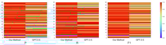 To further evaluate CEP-PKA’s stability and robustness, we tested its performance across 65 event types in DuEE. As illustrated in Figure 7, CEP-PKA consistently achieves high scores (marked by red blocks), while GPT-3.5’s performance (marked by cool-toned blocks) is less consistent and lower on average. These results confirm that CEP-PKA delivers stronger and more balanced performance across all event types, demonstrating its capability to handle diverse scenarios effectively.