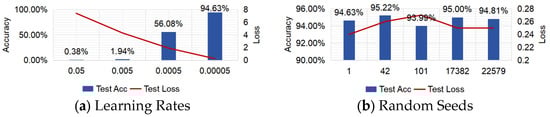 Impact of learning rates and random seeds on the performance of CEP-PKA on DuEE.