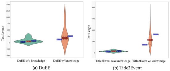 We also explored the influence of padding size on model performance. First, we analyzed the length distribution of original event texts and compared it with that after knowledge augmentation. As shown in Figure 9, for the DuEE and Title2Event datasets, only 1.7% and 5.0% of the data, respectively, exceed the 512-character padding limit. Considering that the maximum input length supported by the ERNIE model is 512, we strategically set the padding size to 512 to cover the vast majority of text instances.
