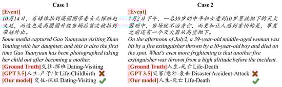 For a qualitative analysis, we analyze two cases in DuEE to evaluate the semantic comprehension capabilities of GPT and CEP-PKA, as shown in Figure 11. Our observations reveal that GPT encounters difficulties in semantic comprehension. In Case 1, GPT misclassified the event as “Life-Childbirth” due to overemphasizing the phrase “becoming a mother” while ignoring the core action “visiting”; CEP-PKA correctly identified the event type by integrating global context. In Case 2, GPT focused narrowly on the word “hit” and incorrectly predicted “Disaster/Accident-Attack”, failing to recognize the event’s ultimate outcome of “death”. These examples demonstrate CEP-PKA’s ability to capture holistic semantics rather than relying on isolated keywords, highlighting its robustness against semantic interference.
