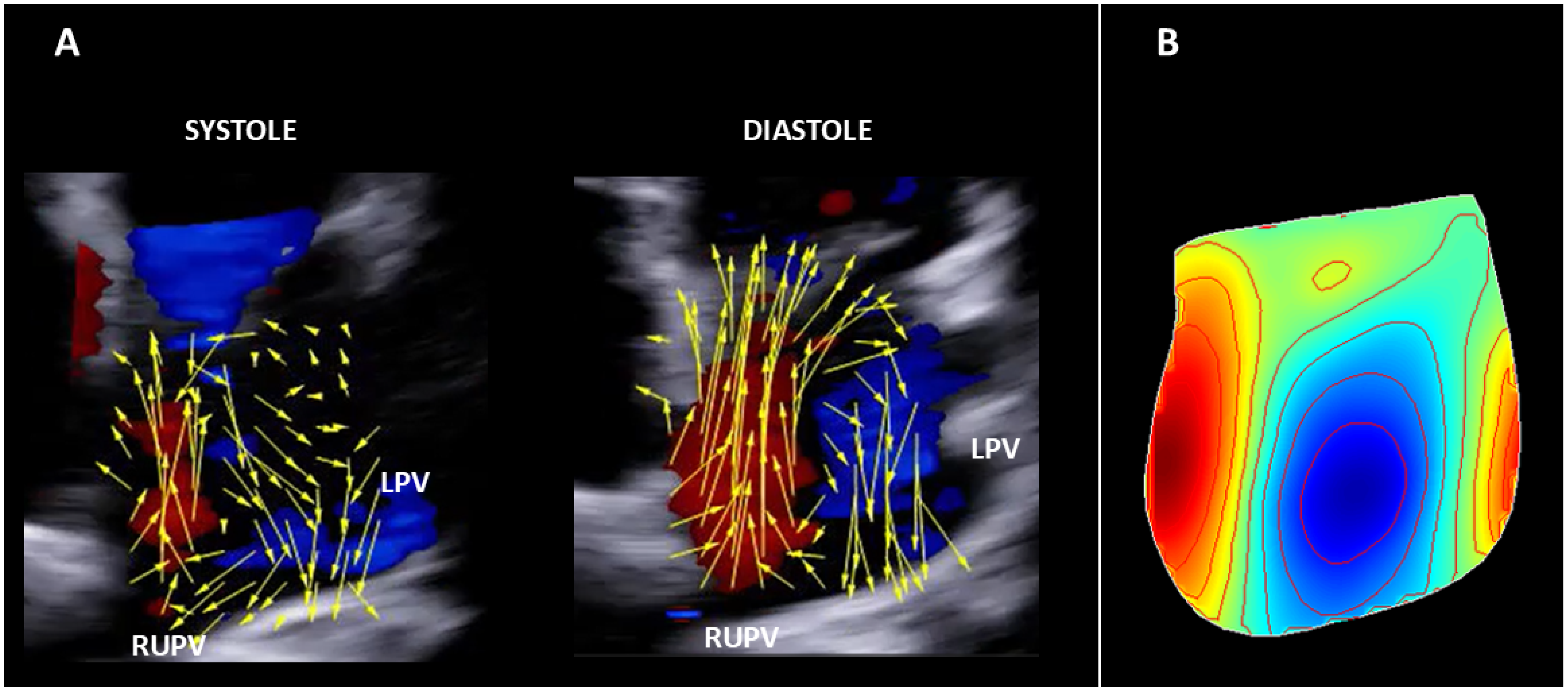 Figure 1. (A) Flow velocity vector map showing a clockwise rotating vortex in the left atrium in a normal subject in sinus rhythm. (B) Left atrial steady-streaming flow map of one heartbeat obtained in the same subject. Clockwise blood rotation is depicted in blue. LPV, left pulmonary vein. RUPV, right upper pulmonary vein.