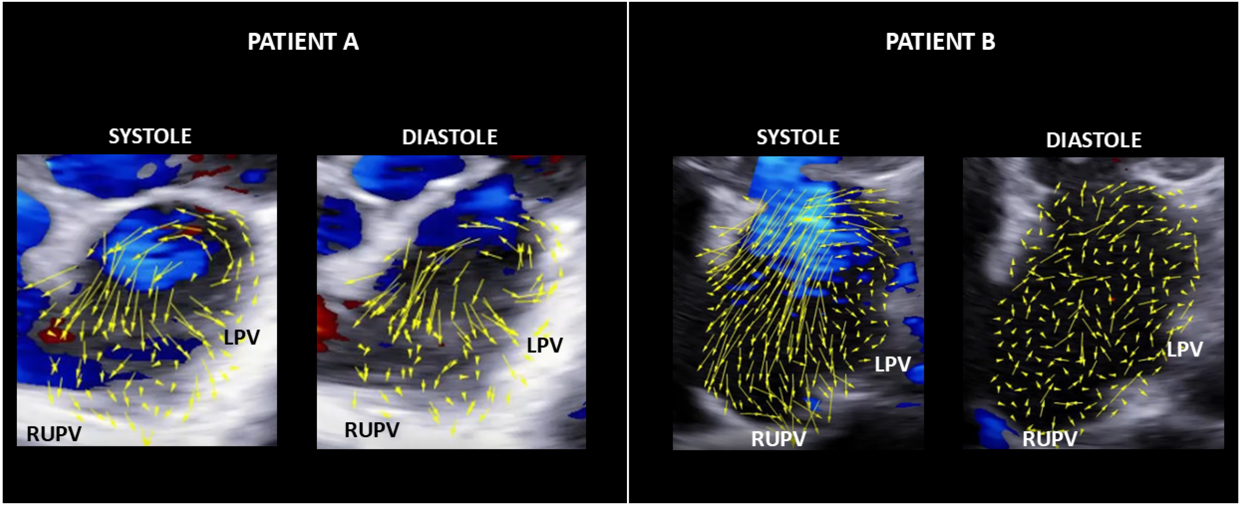 Figure 2. Flow velocity vector map in patients A and B during atrial fibrillation. In both patients, alterations of the left atrial flow dynamics were noted, including periods of counterclockwise rotation of the vortex structure. In patient B a total disorganization of flow was observed during diastole. LPV, left pulmonary vein. RUPV, right upper pulmonary vein.