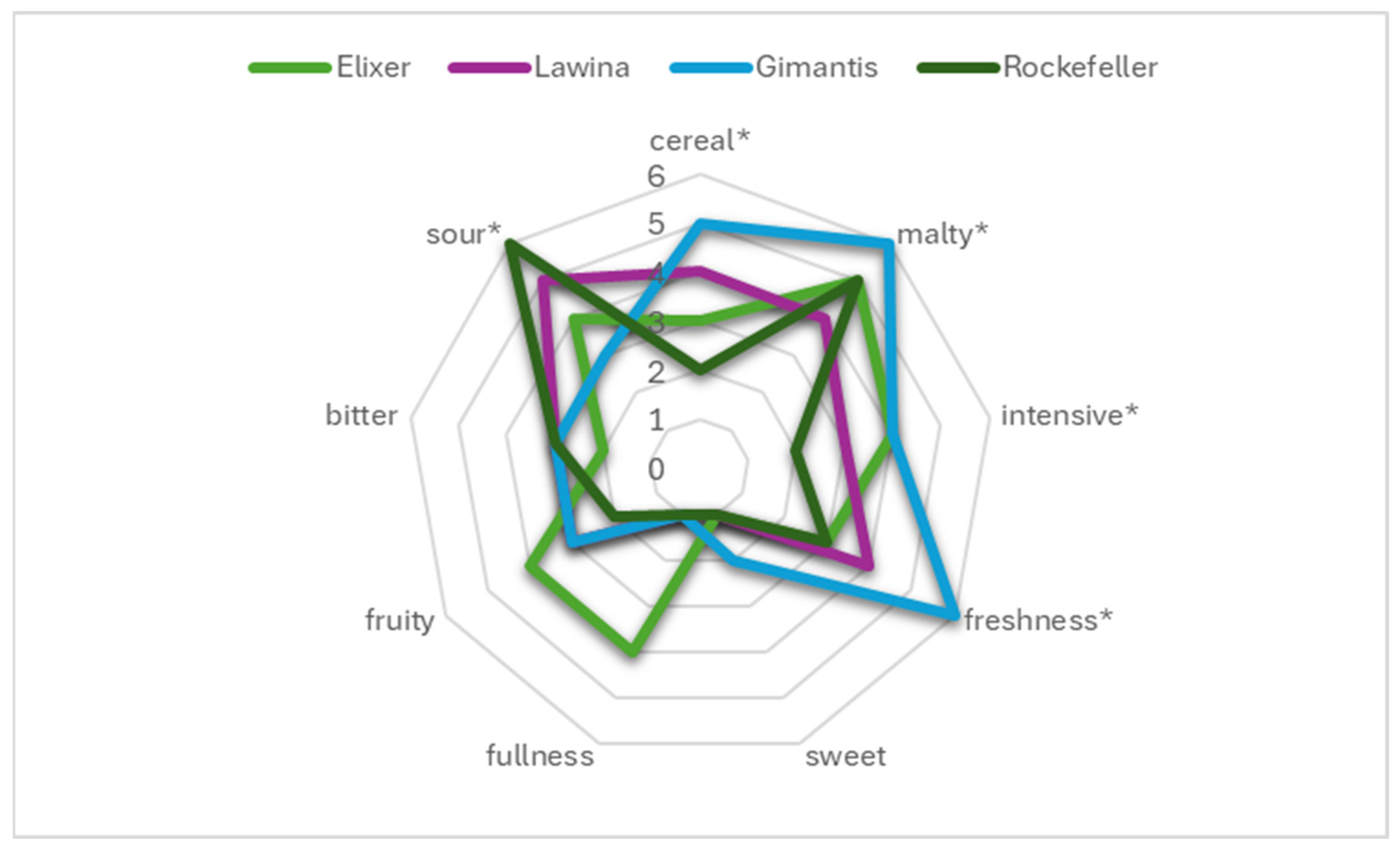 The organoleptic profile of the studied wheat beers varied slightly; wheat beers made with malt produced from the Elixer wheat grain (