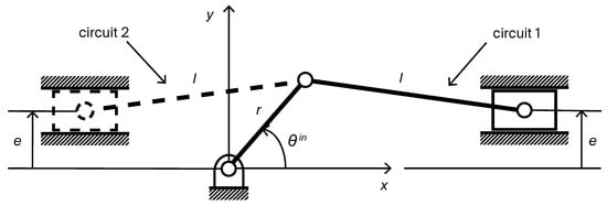 This study considers a four-link slider–crank linkage, as illustrated in Figure 1. The crank (input link) is assumed to undergo a complete counterclockwise rotation. Of the two possible circuits shown in Figure 2, only circuit 1 (slider to the right of the ground pivot) needs to be considered, since the corresponding slider position for the other circuit can be obtained by symmetry, as explained in Section 3.1.3.
