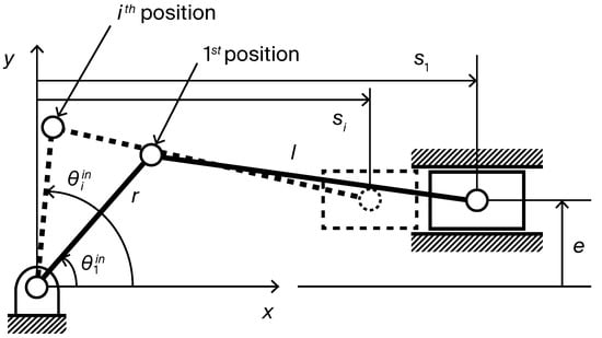 The slider position is determined by three variables corresponding to the linkage dimensions: the crank length r, the connecting-rod length l, and the vertical offset e between the slider axis and the crank axis. For a given crank angle , the slider position s is expressed as []