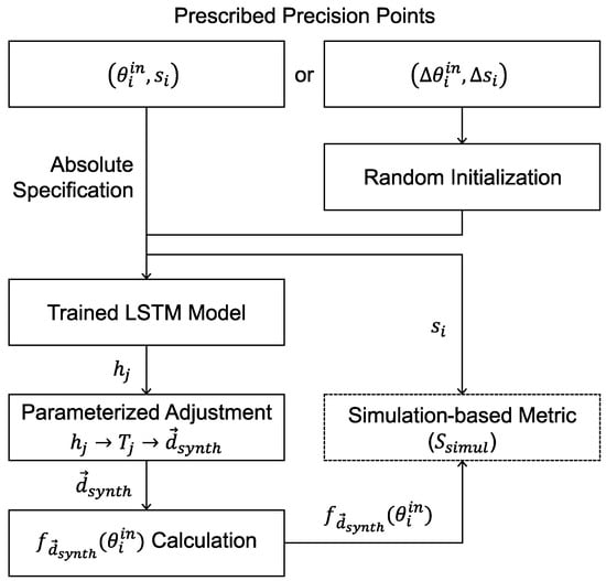 An LSTM-based architecture [,] is adopted for its proven capability in solving sequence-to-prediction problems, which involve processing ordered sequences containing a variable number of precision points. This flexibility allows a single model trained with m precision points to generalize to inputs containing fewer points, while in this study, is chosen to balance between expressiveness and computational efficiency. Beyond the generic LSTM framework, the proposed model integrates two mechanism-specific components, establishing a task-specific architecture tailored for the dimensional synthesis of slider–crank function generators: