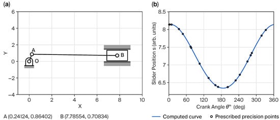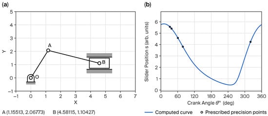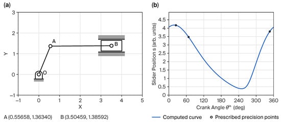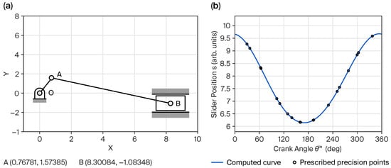 In the following synthesis examples, the prescribed absolute slider position s (or prescribed relative displacement ), the synthesized linkage dimensions , and the corresponding slider position computed from are all expressed in arbitrary units, as the absolute scales of these quantities are irrelevant to the analysis. Accordingly, units are omitted from the tables for clarity.