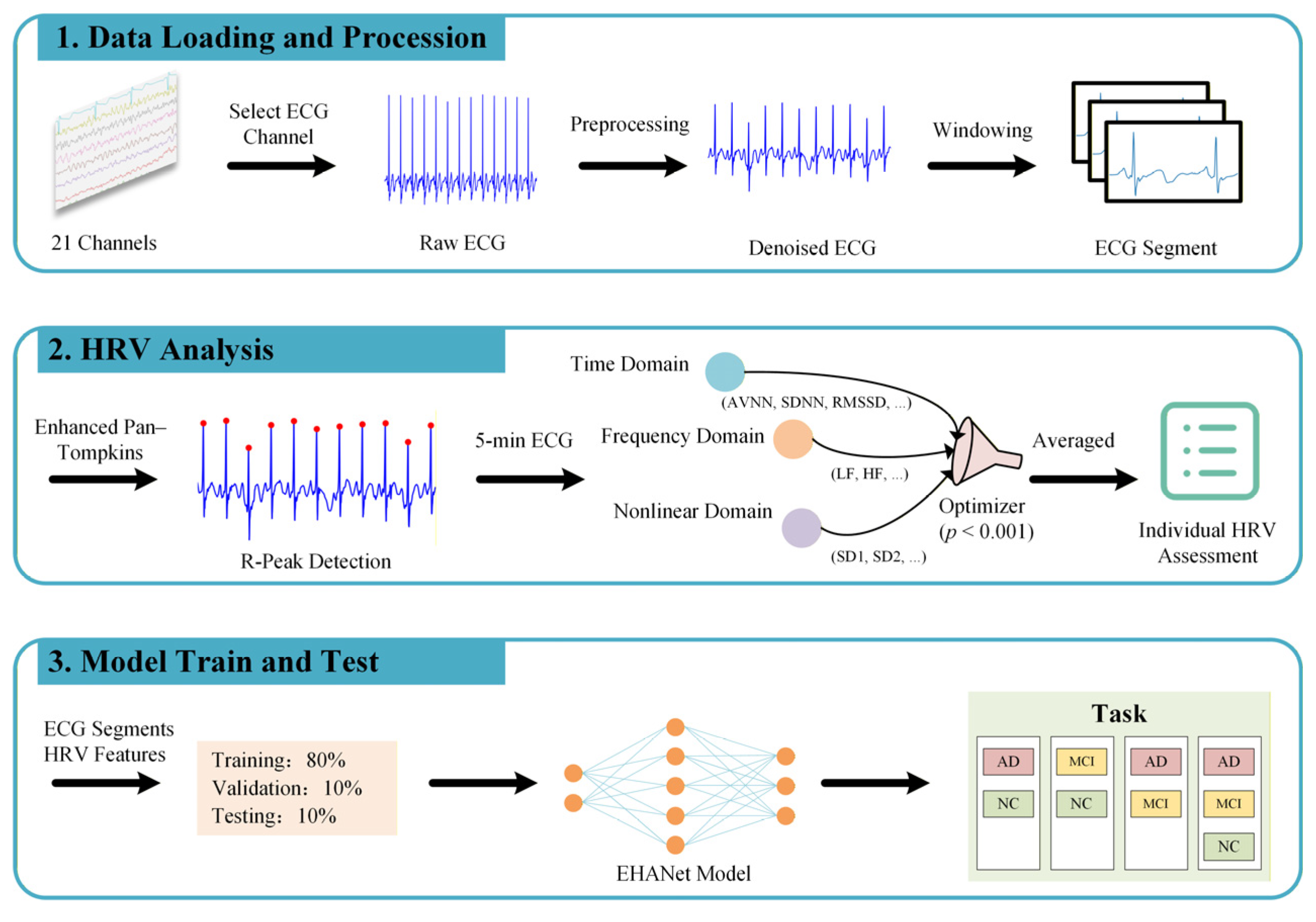 Notably, AD and cardiovascular diseases may share common pathophysiological mechanisms [6,7]. The prospective ARIC–Neurocognitive Study reported that midlife electrocardiographic evidence of left ventricular hypertrophy was independently associated with an increased risk of dementia over approximately 20 years of follow-up, suggesting a potential shared pathological basis between cardiovascular structural remodeling and neurodegeneration [8]. Isaksen et al. [9] identified several common electrocardiogram (ECG) markers associated with AD using a Cox proportional hazards model and demonstrated that these markers improved AD risk prediction. Pathological aggregation of AD-related β-amyloid and tau proteins can lead to neuronal dysfunction and reduced autonomic nervous system complexity [10]. As a key indicator reflecting the balance between sympathetic and parasympathetic regulation, heart rate variability (HRV) derived from ECG signals can sensitively capture alterations in autonomic function [11]. Numerous studies consistently show that cognitive decline is closely associated with reduced HRV. For instance, Imbimbo et al. [12] found that ultra-low-frequency HRV features were positively correlated with MoCA scores among 50 participants with cardiovascular risk factors, indicating that poorer cognitive performance was associated with lower HRV levels. Similarly, in a retrospective study of patients with MCI, Kim et al. [13] reported that individuals who later progressed to AD or dementia with Lewy bodies exhibited lower HRV levels (SDNN, RMSSD, LF, HF). In another study from the same group, elderly women with cognitive impairment—defined by MMSE scores below 24—also showed reduced high-frequency HRV power [14]. Building on these findings, an increasing number of studies have modeled HRV features for the identification of cognitive impairment. Xavier et al. [15], based on a cohort of 297 participants, demonstrated significant differences in time-domain HRV features between individuals with MCI and normal controls (NC), achieving an MCI classification accuracy of 80.80% using models such as support vector machines (SVM). These findings suggest that ECG signals may contain information reflective of the underlying pathological changes and disease progression of AD. Compared with EEG, ECG—well-suited for wearable devices and home-based monitoring—shows substantial potential for the identification of AD and MCI.