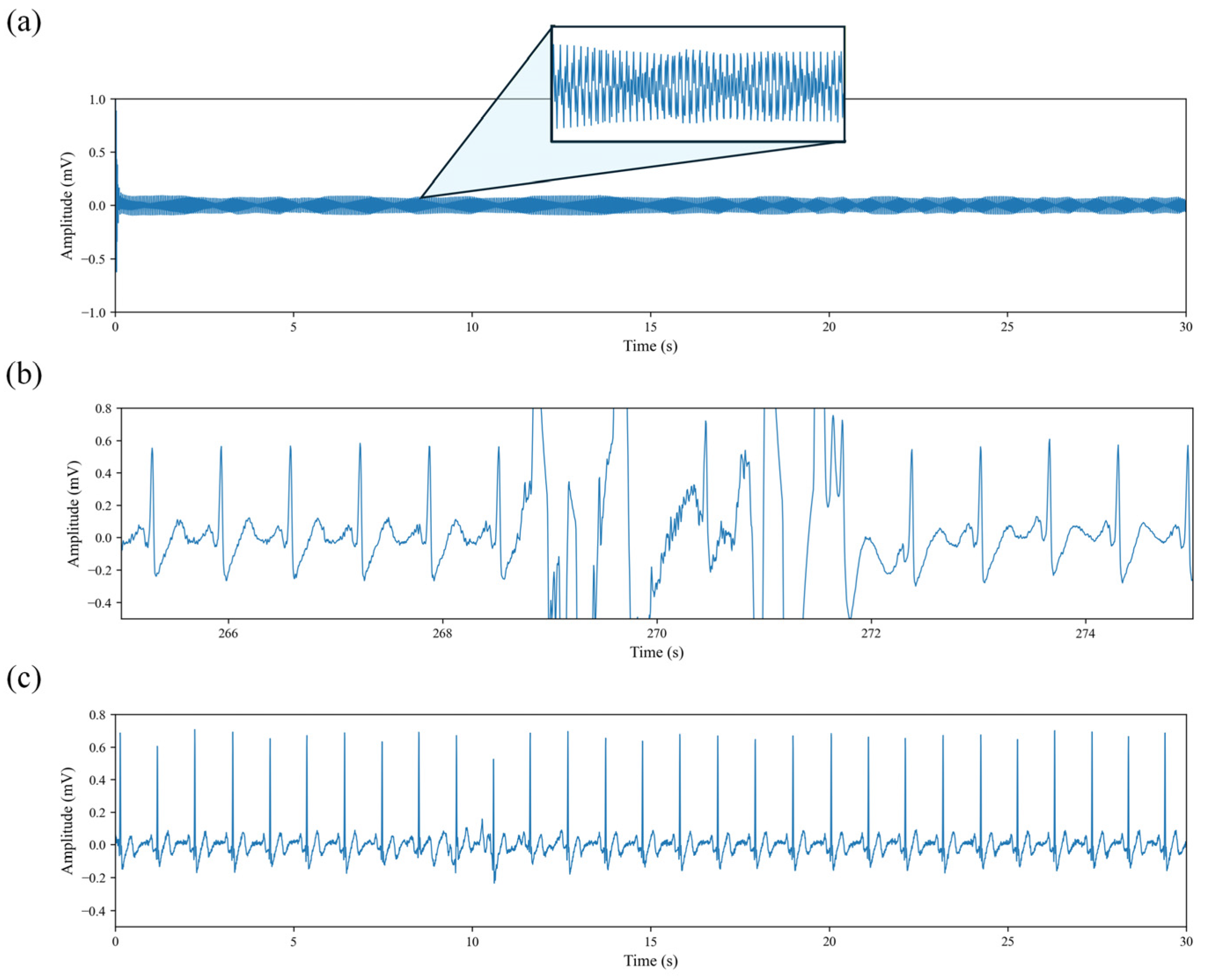 ECG signals are highly susceptible to contamination from acquisition devices and environmental conditions, including motion artifacts, poor electrode contact, and power-line interference [19]. After the publicly available dataset had already undergone power-line noise removal, we performed additional preprocessing steps to address remaining issues. As illustrated in Figure 2, certain recordings presented severe signal degradation. In particular, the waveform shown in Figure 2a contains no recognizable physiological information. After manually inspecting the ECG recordings of all subjects, such segments were excluded from subsequent analyses, as they provide no meaningful contribution to the objectives of this study.