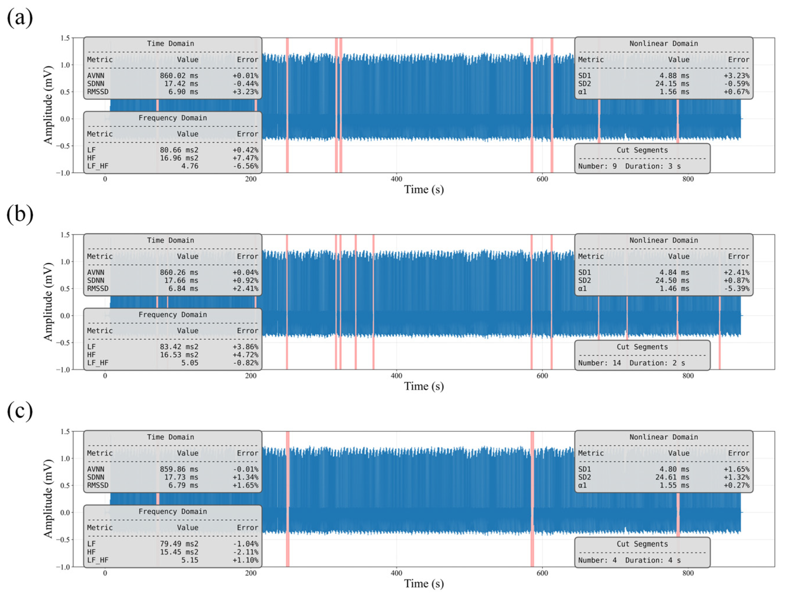 To verify that this strategy does not introduce systematic bias, we conducted a simulation experiment on clean ECG recordings by randomly removing segments and reconstructing the signals. As shown in Figure 3, the Value denotes the HRV level computed from the reconstructed signal, while Error represents its percentage deviation from the original HRV values. All errors were below 10%, indicating that the impact of this procedure on HRV information is negligible.