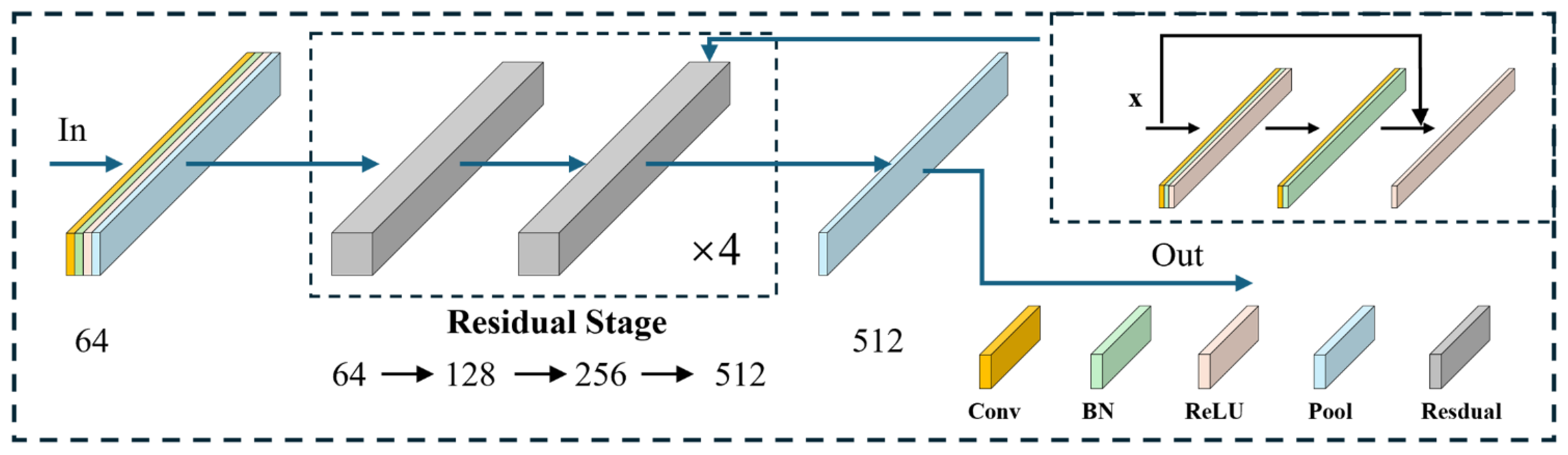 For feature extraction, we implemented a one-dimensional residual convolutional network based on ResNet18 [26], which has demonstrated strong performance in ECG classification tasks due to its skip-connection design [27]. The network comprises four residual stages, each with two residual blocks, as illustrated in Figure 5. Each block introduces identity mappings via skip connections, expressed in Equation (1), which alleviate gradient vanishing as depth increases.