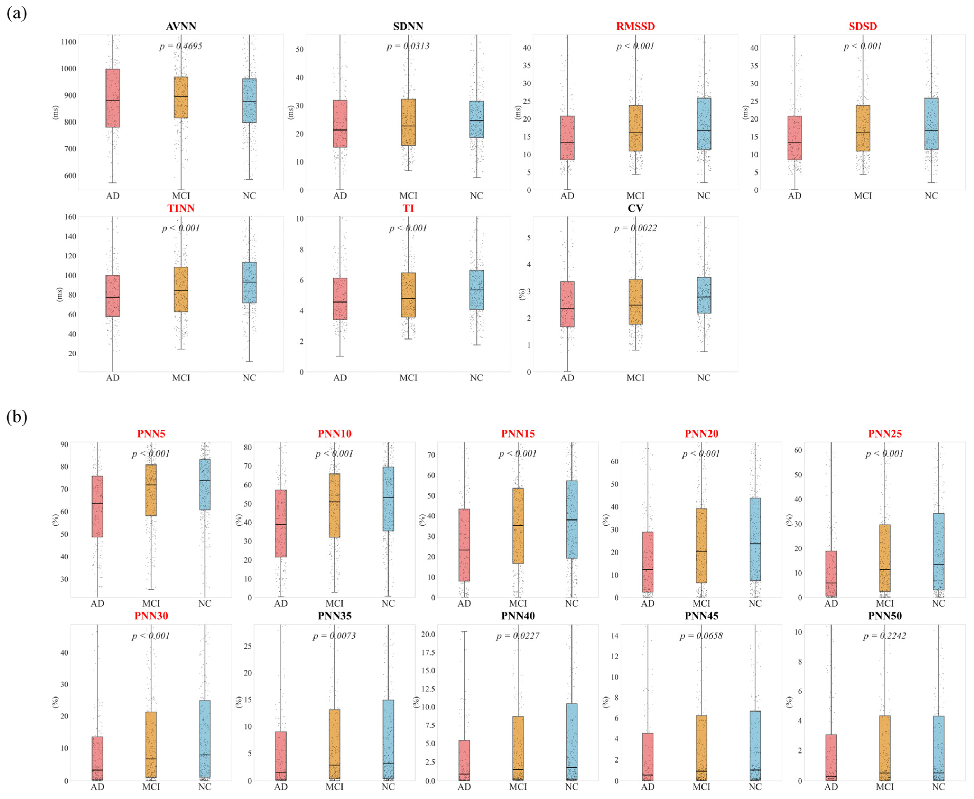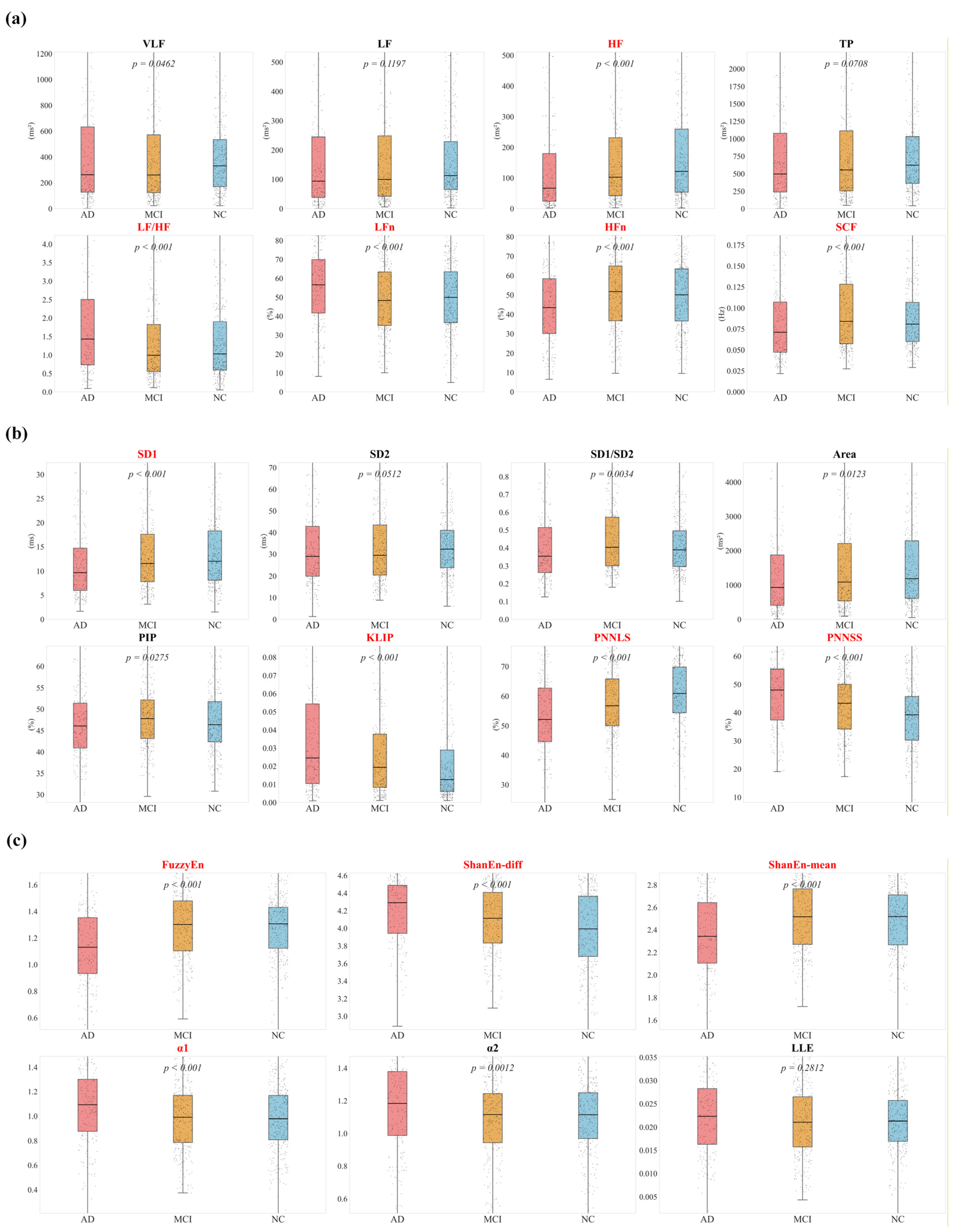 Comprehensive HRV quantification and visualization of group differences across AD, MCI, and NC subjects;