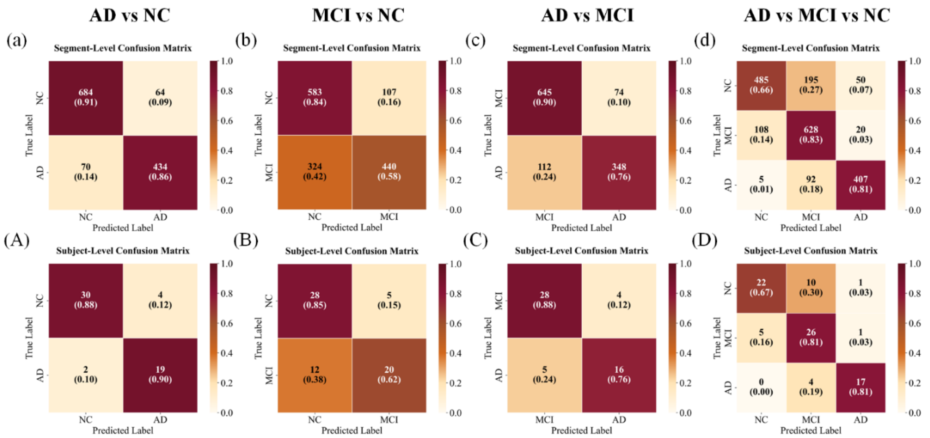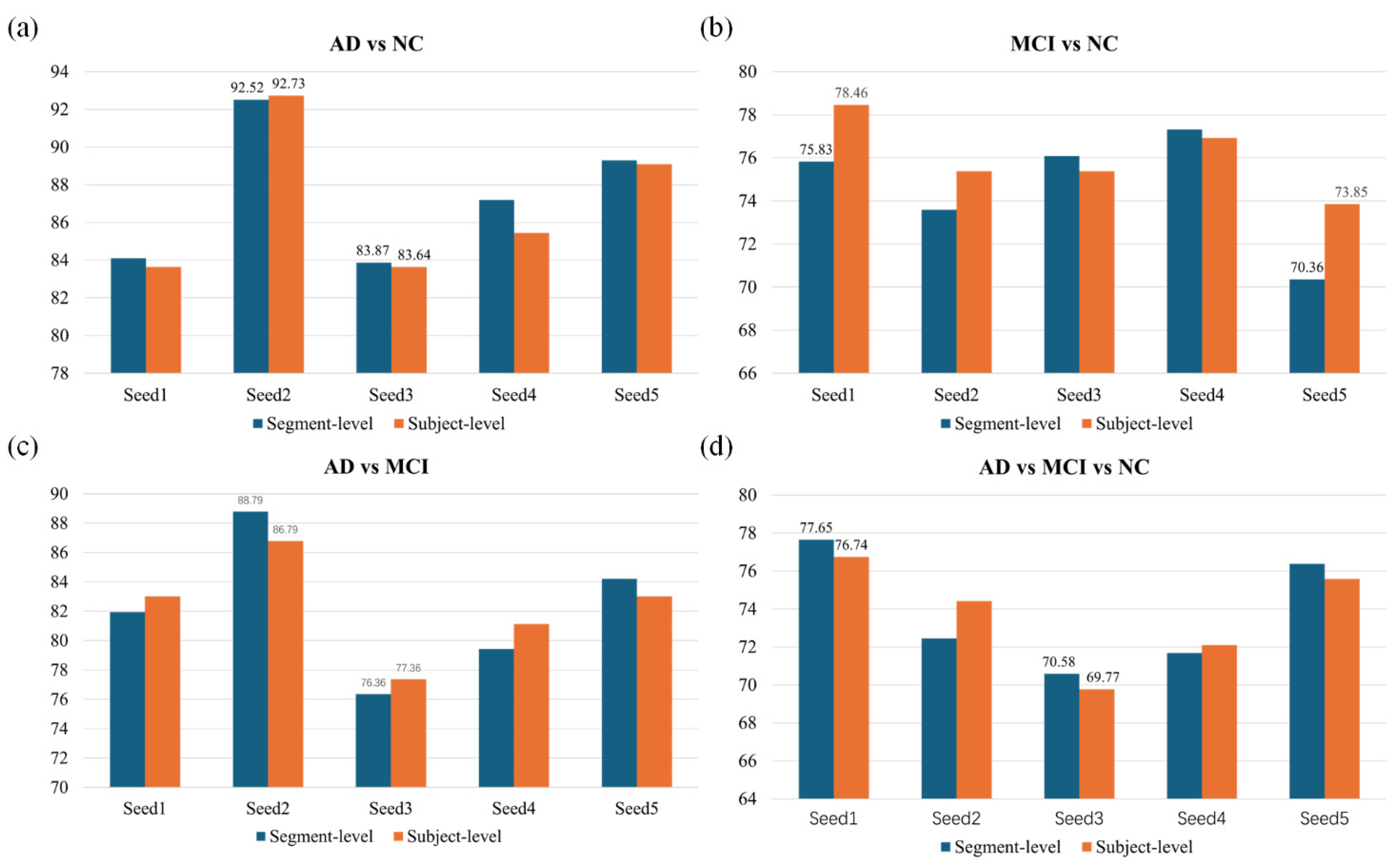 The EHANet framework was evaluated across four classification tasks (AD vs. NC, MCI vs. NC, AD vs. MCI, and AD vs. MCI vs. NC). We analyzed both the segment-level classification performance and the subject-level performance obtained by aggregating all 60s segments from the same subject using a soft-voting strategy.