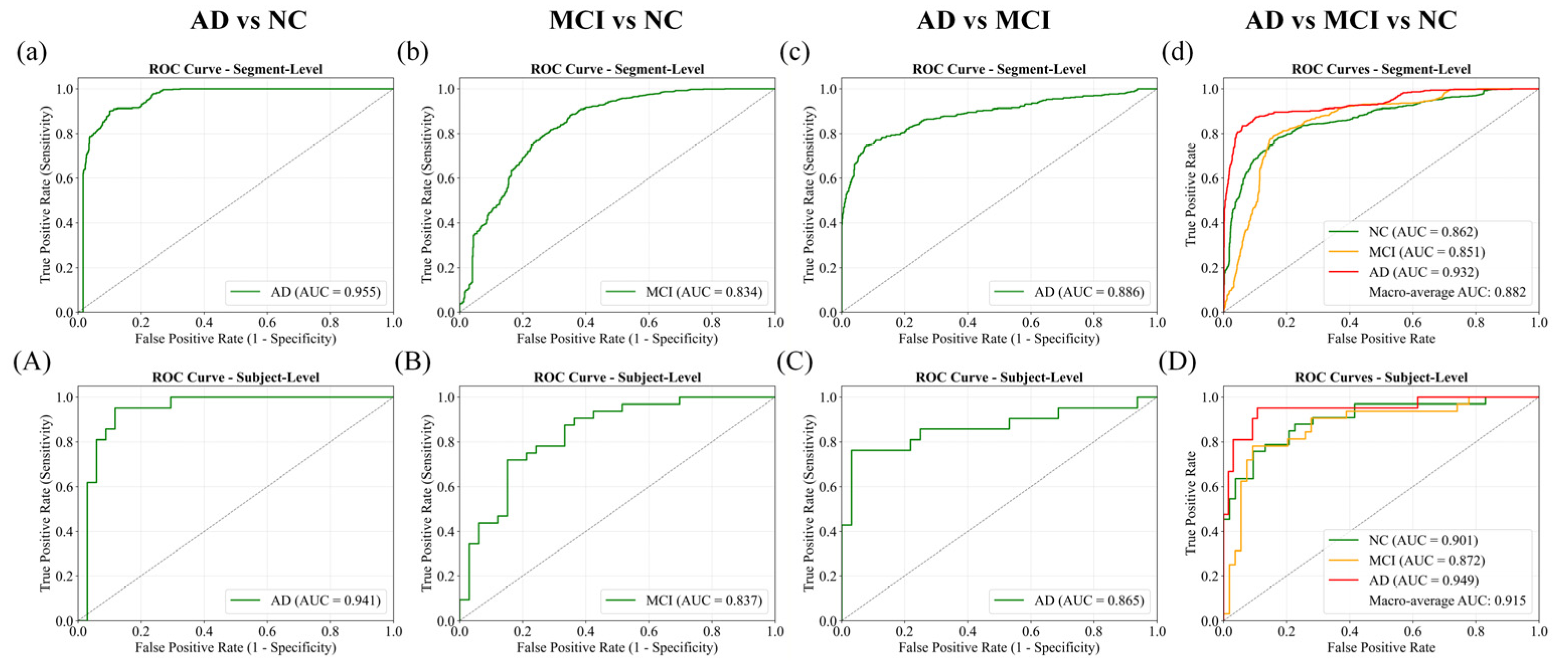 Receiver Operating Characteristic (ROC) curves with corresponding AUC values are presented in Figure 10. The AD vs. NC task achieved the best discrimination, with AUCs of 0.955 at the segment level and 0.941 at the subject level. AD vs. MCI also performed strongly (0.886 and 0.865), while MCI vs. NC showed lower separability, with AUCs around 0.834–0.837. In the three-class scenario, one-vs.-rest ROC curves confirmed effective separation, yielding macro-average AUCs of 0.882 at the segment level and 0.915 after subject-level aggregation, underscoring the benefit of majority voting in enhancing robustness.