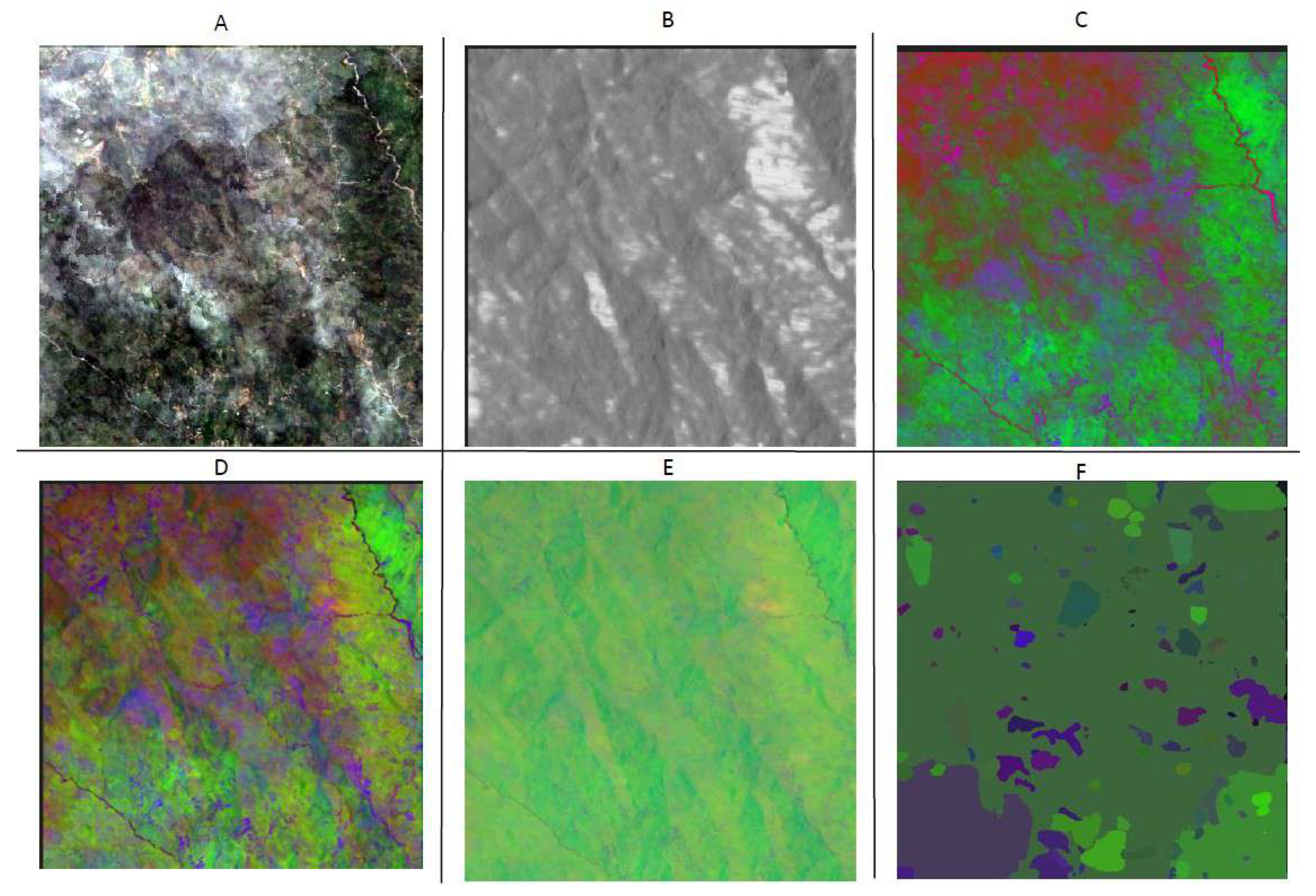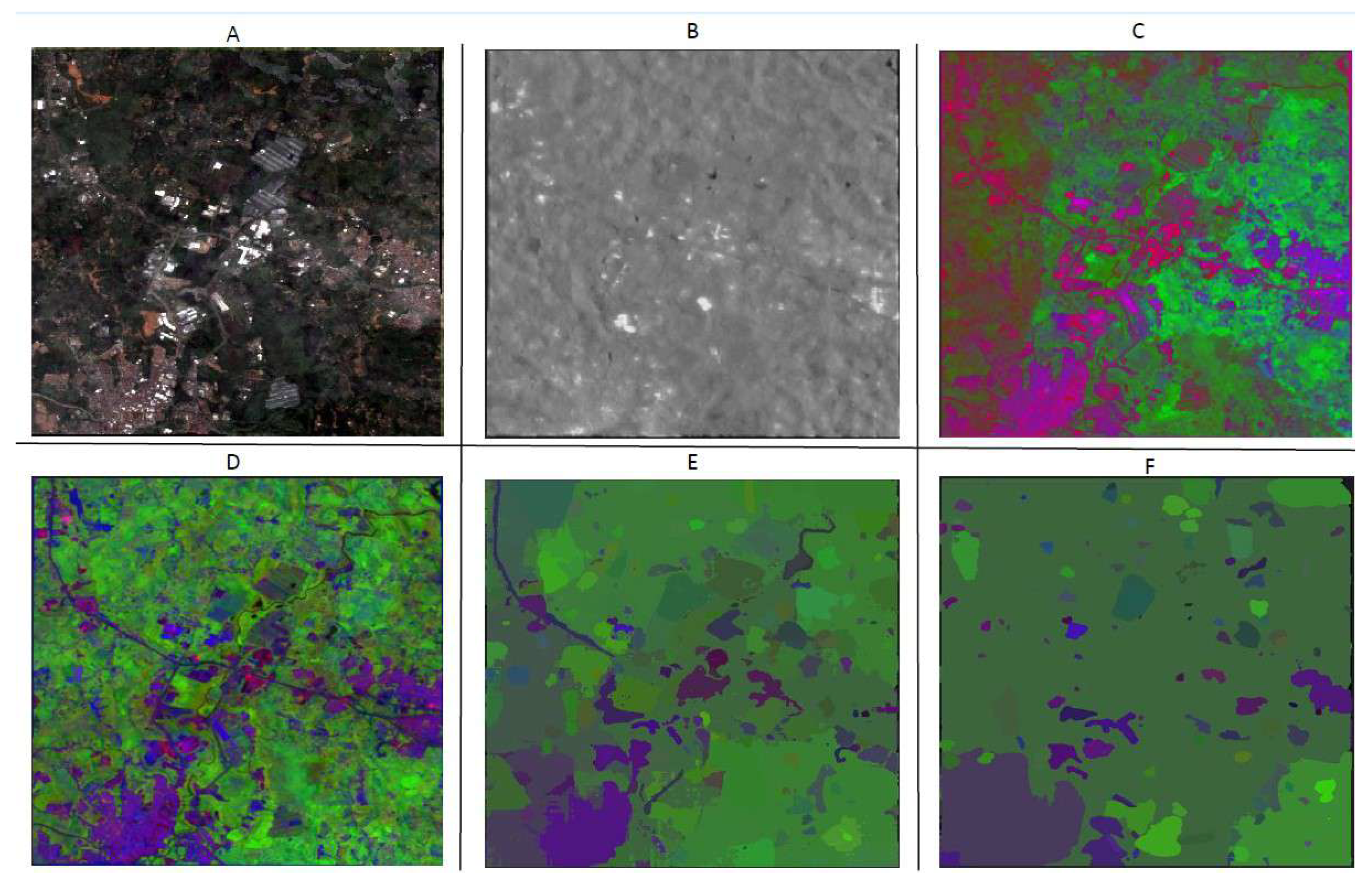 The NDVI, meanwhile, distinguishes, through its range of green tones, areas with greater vegetation density from those with little or none. Finally, images D, E, and F—where SAM is applied respectively to RGB, SAR, and the combined indices—facilitated the interpretation of the scene by better discretizing the values that are originally presented in the images, segmenting by similarity.