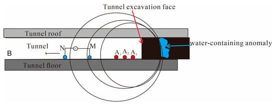 Currently, the direct-current (DC) three-pole method is widely utilized for subsurface detection []. Typically, this configuration comprises three current electrodes (A1, A2, A3) and a pair of potential electrodes (M, N) arranged within the tunnel, while the return electrode (B) is positioned at effective infinity to simulate semi-infinite boundary conditions. When a current is applied to the A pole, an equipotential surface with the A pole in the center and equal potential values will be formed to reflect the electrical structure of the underground space. At the same time, the measuring electrode will gradually move equidistantly backward along the direction of the tunnel (as shown in Figure 1). By collecting data recorded at different locations, the apparent resistivity ρs at each measurement location can be calculated according to Equation (1) []: