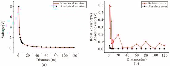In this study, COMSOL is used to construct a three-dimensional point-source error-testing model. The computational domain is defined as a sphere with a radius of 100 m and a uniform conductivity of 0.01 S/m. An infinite-element layer with a thickness of 10 m is applied to approximate the infinite boundary condition, and a current of 1 A is injected. To balance computational accuracy and efficiency, the mesh size is set within the range of 0.45–10.5 m. By comparing the numerical results with the analytical solution, the maximum relative error is 0.5957%, and the maximum absolute error is 0.0474 V, as shown in Figure 2.