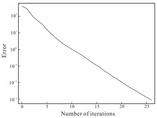 COMSOL is used to establish a three-dimensional uniform full-space stratigraphic model. The model is defined as a cylinder with a radius of 100 m and a length of 150 m, containing a 30 m-long tunnel and a 40 m × 40 m × 30 m water-bearing anomalous body. The conductivity of the air is set to 0.01 S/m, while the conductivity of the water-bearing anomaly is set to 0.07 S/m. A coil of dimensions 1.5 m × 1.5 m is positioned in front of the tunnel, with 10 turns and a current of 3 A applied. The simulation uses a transient calculation method, with the finite difference time domain (FDTD) method employed for the solution. As the number of iterations increases to 25, the error is gradually reduced to 10−3 (shown in Figure 3). The calculated results meet the accuracy requirements for the simulation.