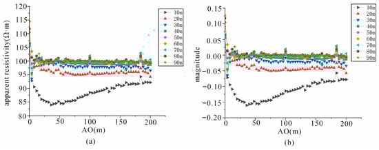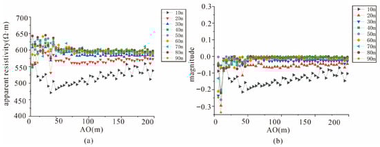 As shown in Figure 6a, the apparent resistivity curves fall within the range of 450–700 Ω·m. A pronounced low-resistivity response is observed near the current electrode, and the curves gradually converge toward the coal-seam resistivity of approximately 600 Ω·m as the AO distance increases. At short offsets, the apparent resistivity curves corresponding to different anomaly distances exhibit substantial dispersion, whereas at larger offsets they progressively converge toward the background resistivity. The most prominent low-resistivity anomalies occur when the anomaly lies 10–30 m from the source. In this interval, the apparent resistivity varies between 471 Ω·m and 568 Ω·m, with an absolute change of 0.05–0.21 and a maximum relative variation of 16.7%. At greater distances (40–90 m), the low-resistivity response weakens markedly, and the extrema of the curves decrease and shift slightly outward. This attenuation indicates the progressive reduction in coupling strength between the water-bearing anomaly and the surrounding current field.