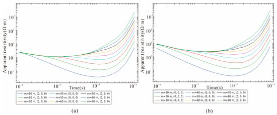 Figure 7a shows that in a homogeneous medium, the apparent resistivity exhibits a characteristic pattern: it first decreases and then increases with measurement distance. This behavior reflects the combined effects of current convergence and enhanced magnetic-dipole coupling associated with the near-field induction response of the low-resistivity water-bearing anomaly. When the receiving coil is either too close or too far from the anomaly, the contribution of the secondary field diminishes, causing the apparent-resistivity curve to rise again. However, the apparent-resistivity variation for the layered model (Figure 7b) is slightly higher at equivalent offsets than that observed in the homogeneous case. Moreover, the entire response curve shifts toward greater distances. This rightward shift indicates that the coal seam functions as a shielding or shunting layer: its higher resistivity restricts the penetration of primary current into the water-bearing anomaly, thereby reducing the strength of the secondary induced current. As a result, the electromagnetic coupling between the receiving coil and the anomaly weakens noticeably.