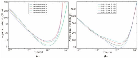 Apparent resistivity change curve caused by angle: (a) no stratum, (b) layered stratum.