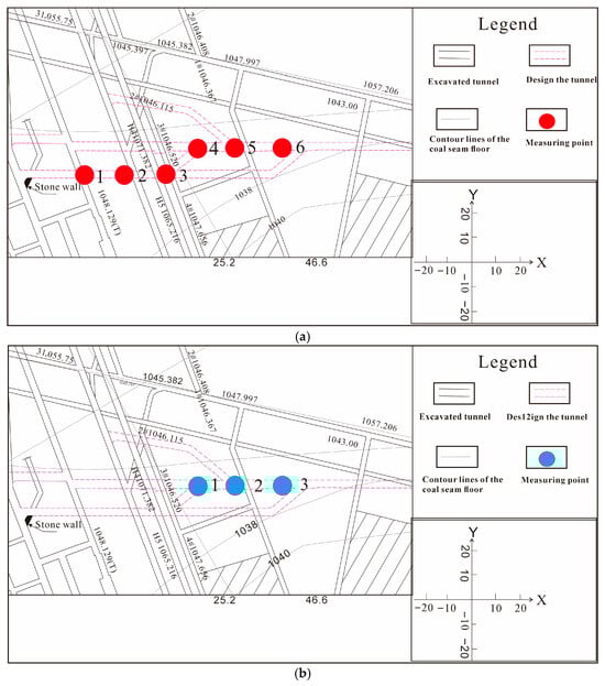 To validate the conclusions derived from geoelectric forward modeling for practical detection applications, underground field experiments were conducted at the Tashan Coal Mine. During the excavation of the 30,517 working face, water seepage was observed. To ensure the safe excavation of the tunnel, both the transient electromagnetic method and the direct current method were employed for advanced detection on site. In the field test, six measurement points were arranged for the transient electromagnetic method, and three measurement points were established for the direct current method. The layout of these measurement points is shown in Figure 9: (a) for the transient electromagnetic method and (b) for the direct current method.