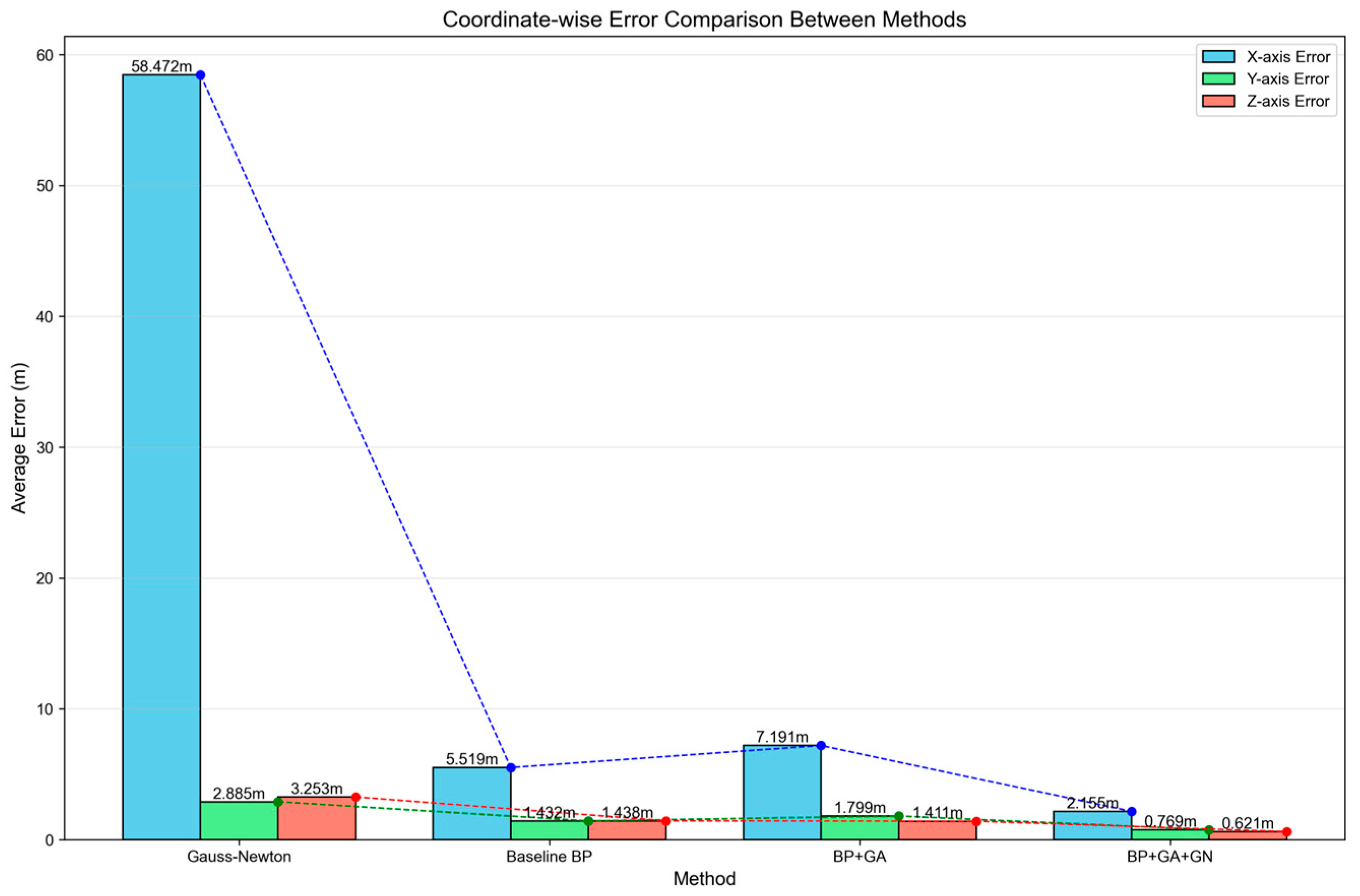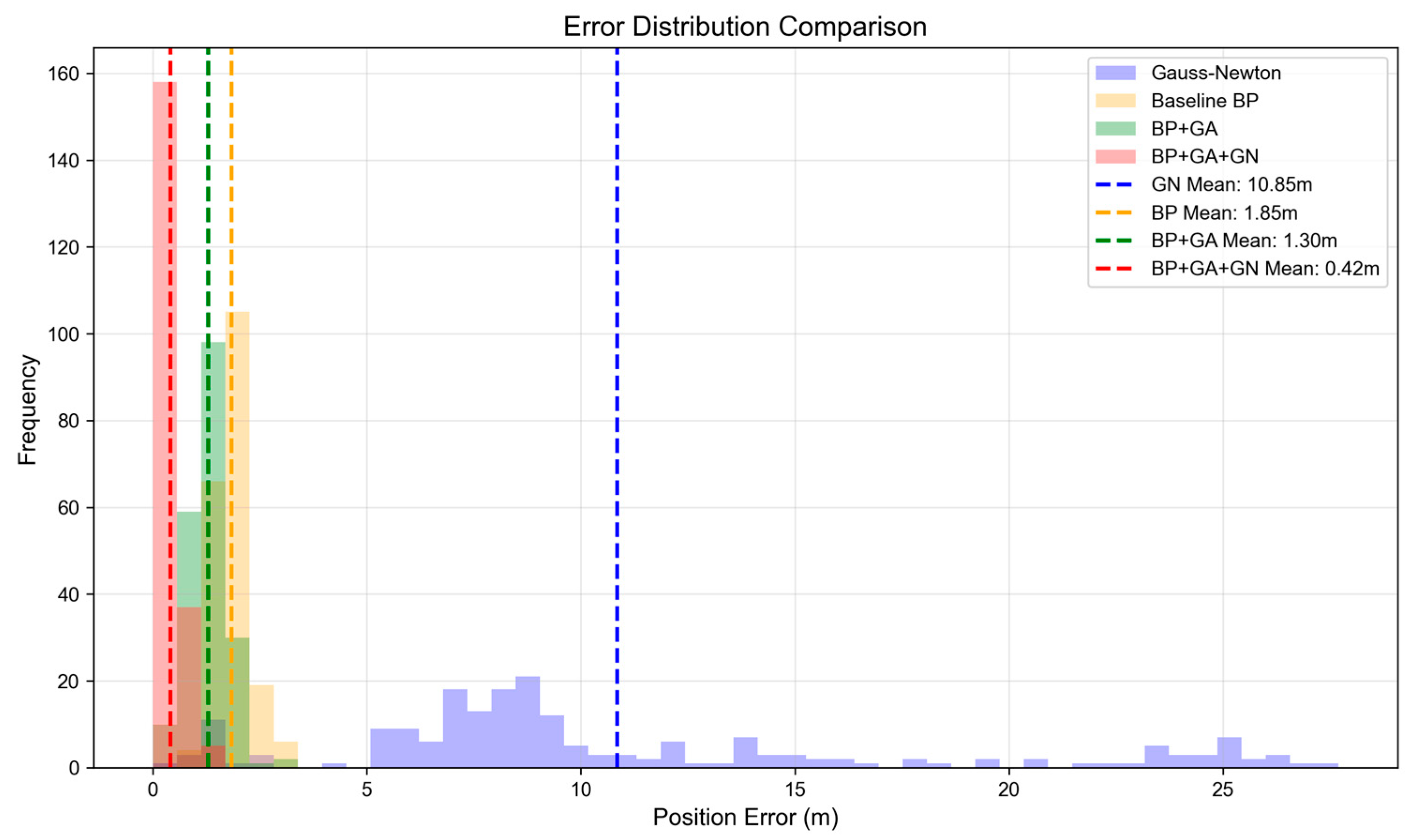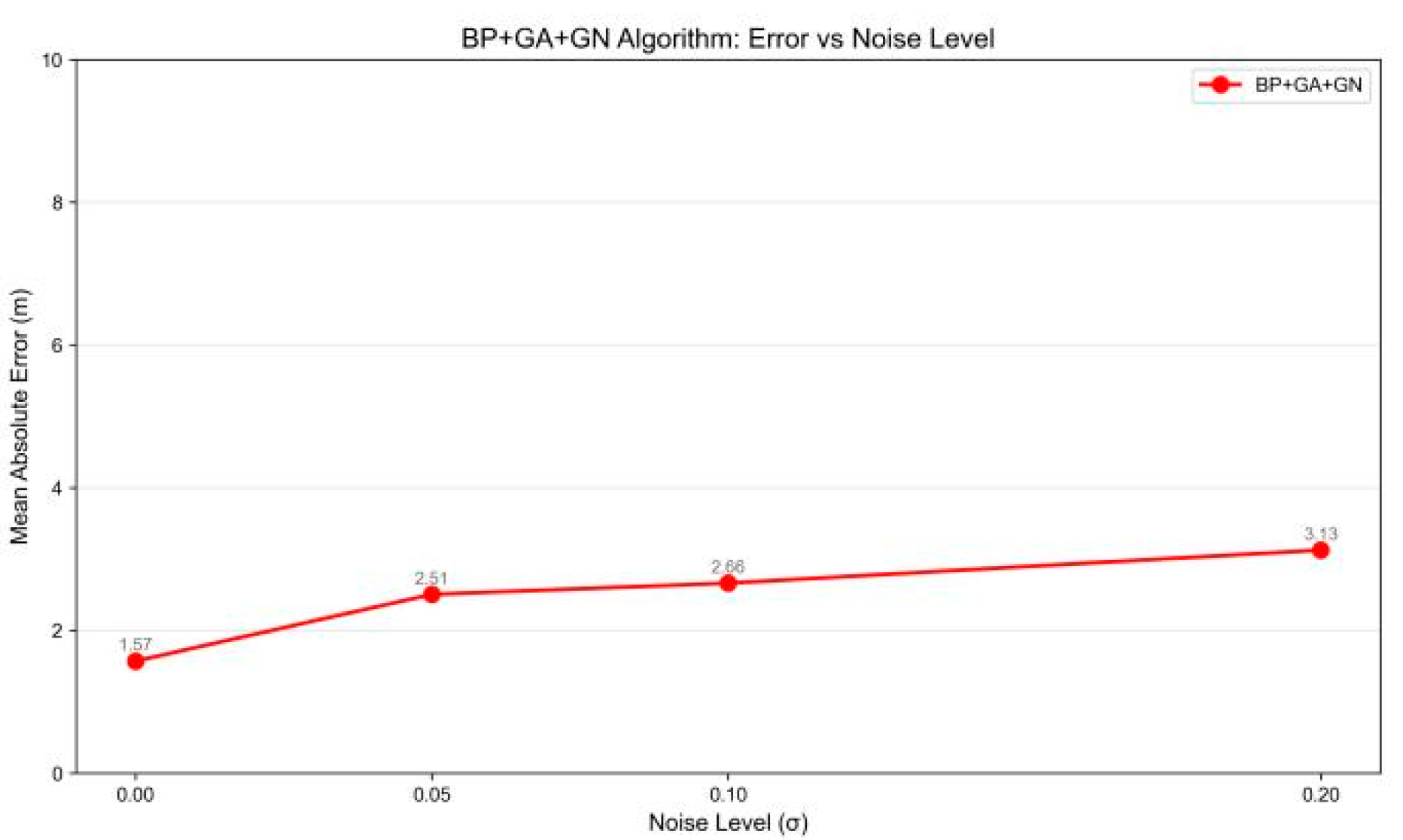 - The BP-GA-GN fusion algorithm adopts a deep integration of physical models and data-driven approaches. By relying on the physical geometric model of seismic wave propagation, it constrains and refines the learning results of the BP network, bridging the gap between pure data-driven “black-box” models and physical laws to some extent. This mechanism not only enhances the physical interpretability and reliability of the localization results but also accelerates convergence speed, overcoming the accuracy stagnation problem that may occur during BP network training.